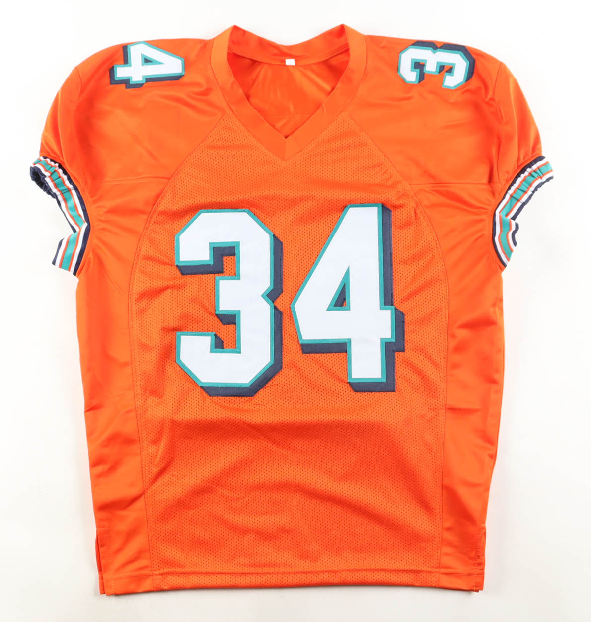 Custom jersey with everything sewn on, size XL. Hand-signed by Ricky Williams. Please note, glue is visible through the reverse number.