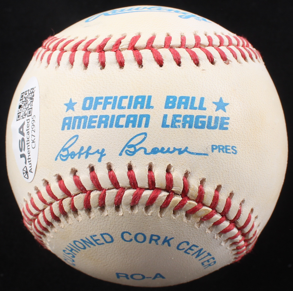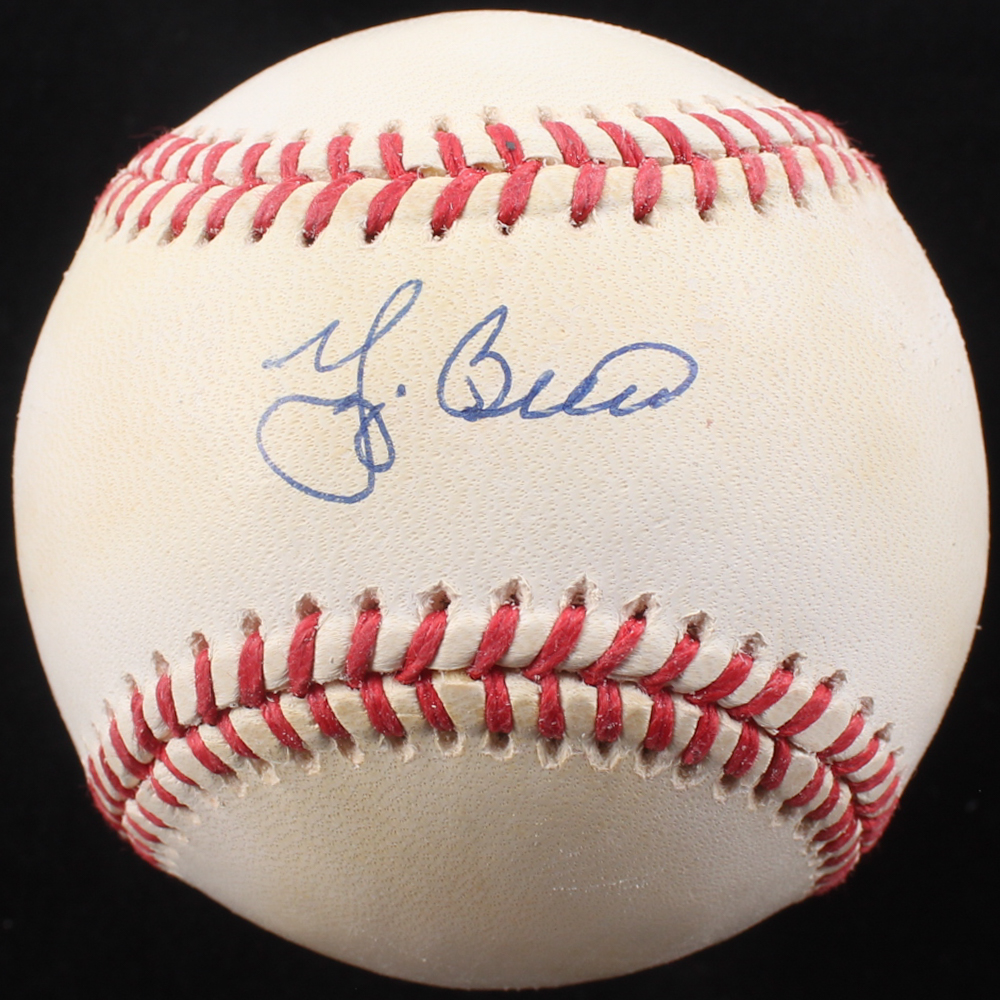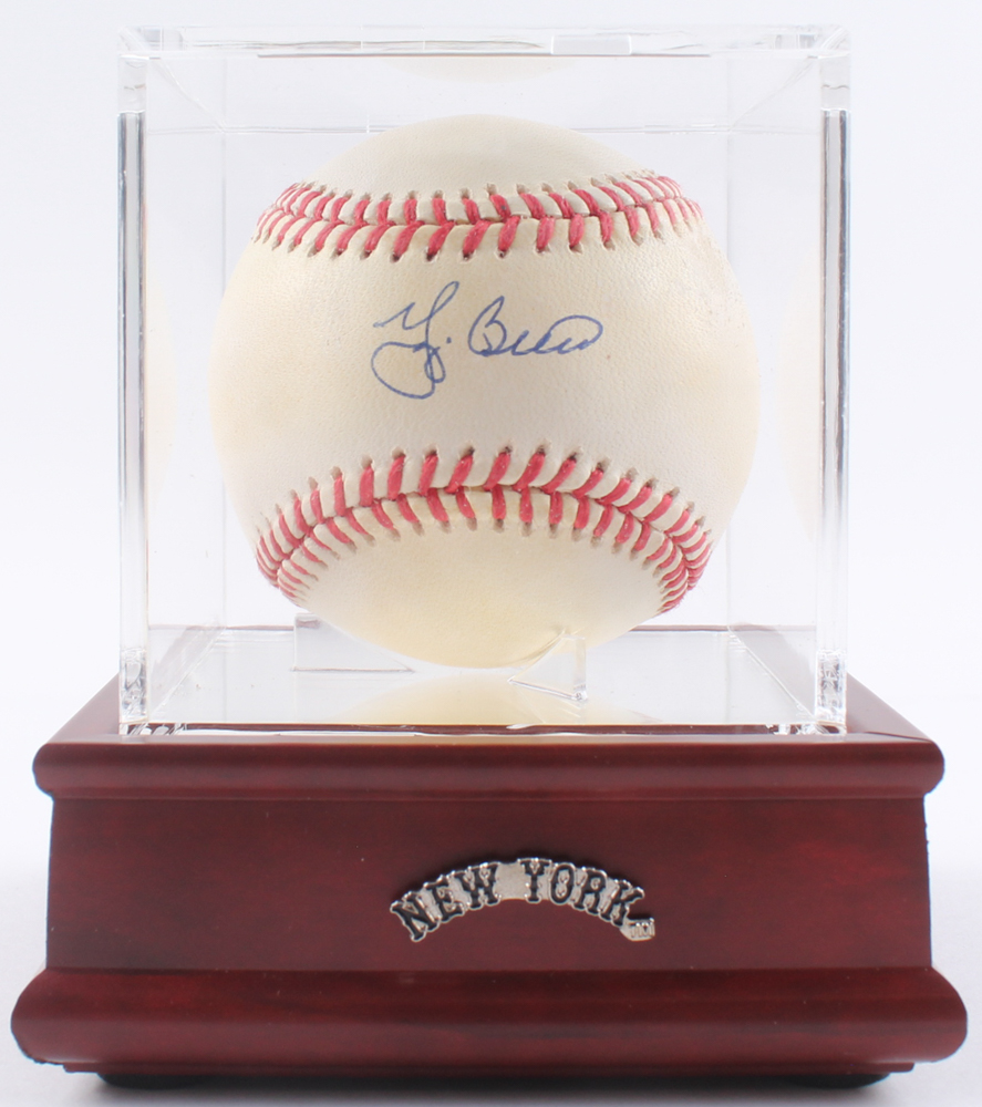 Rawlings Official American League Baseball. Hand-signed by Yogi Berra (D. 2015, New York Yankees, HOF). Please note that the display case and Giants Logo pin are included in the listing, see photos for more details on condition of item.
