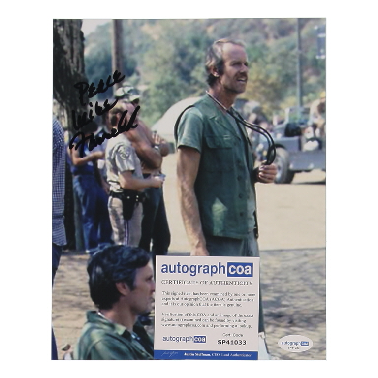 Photo measures 8" x 10" in size and has been hand-signed and inscribed by Mike Farrell.