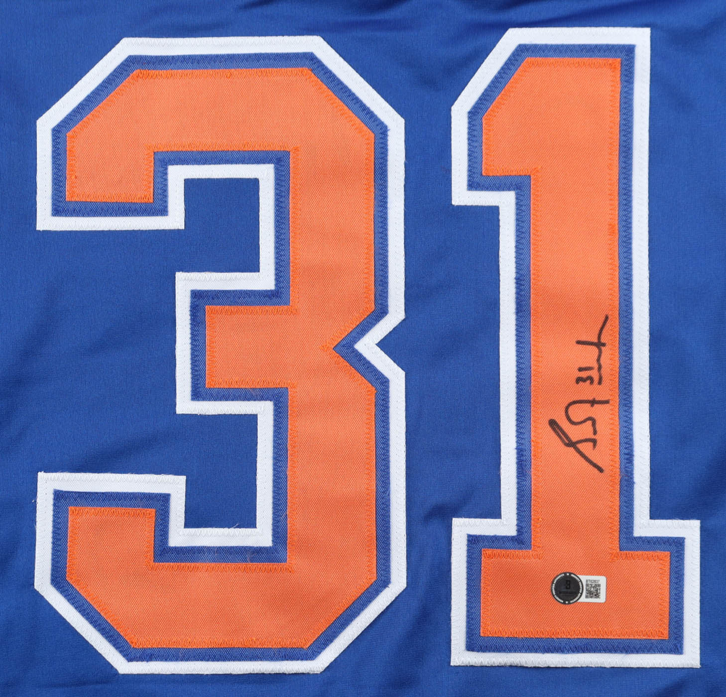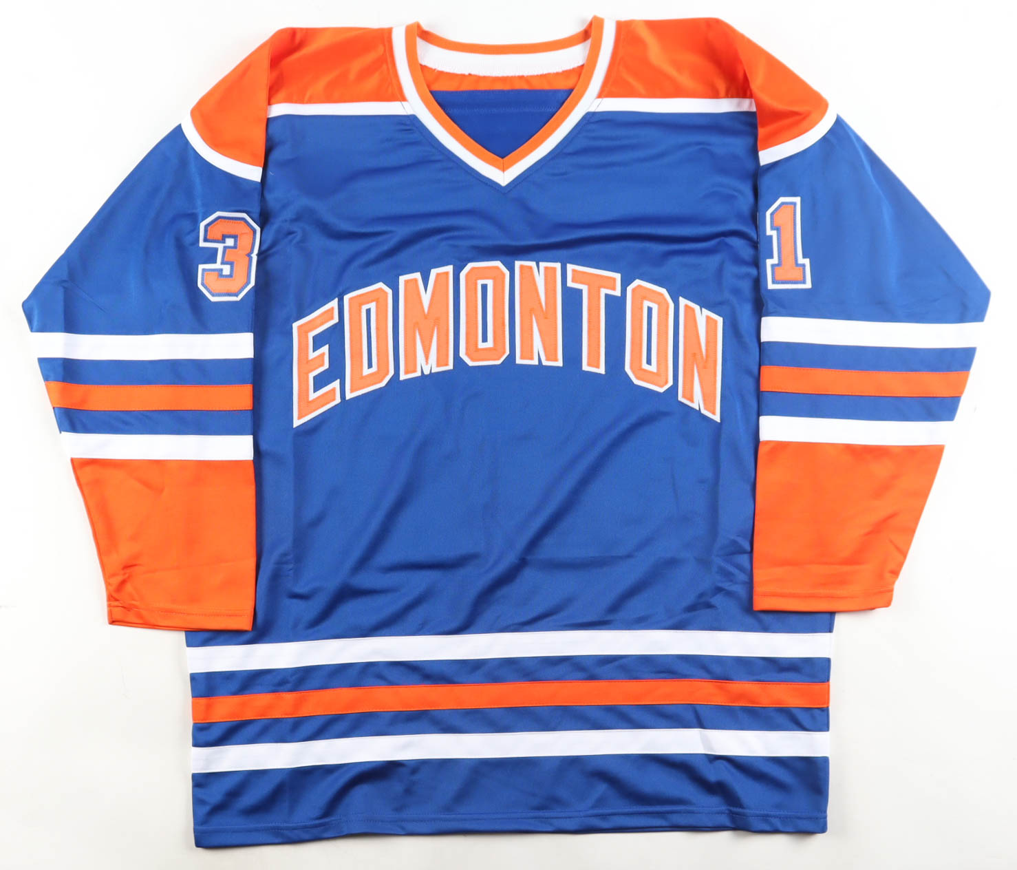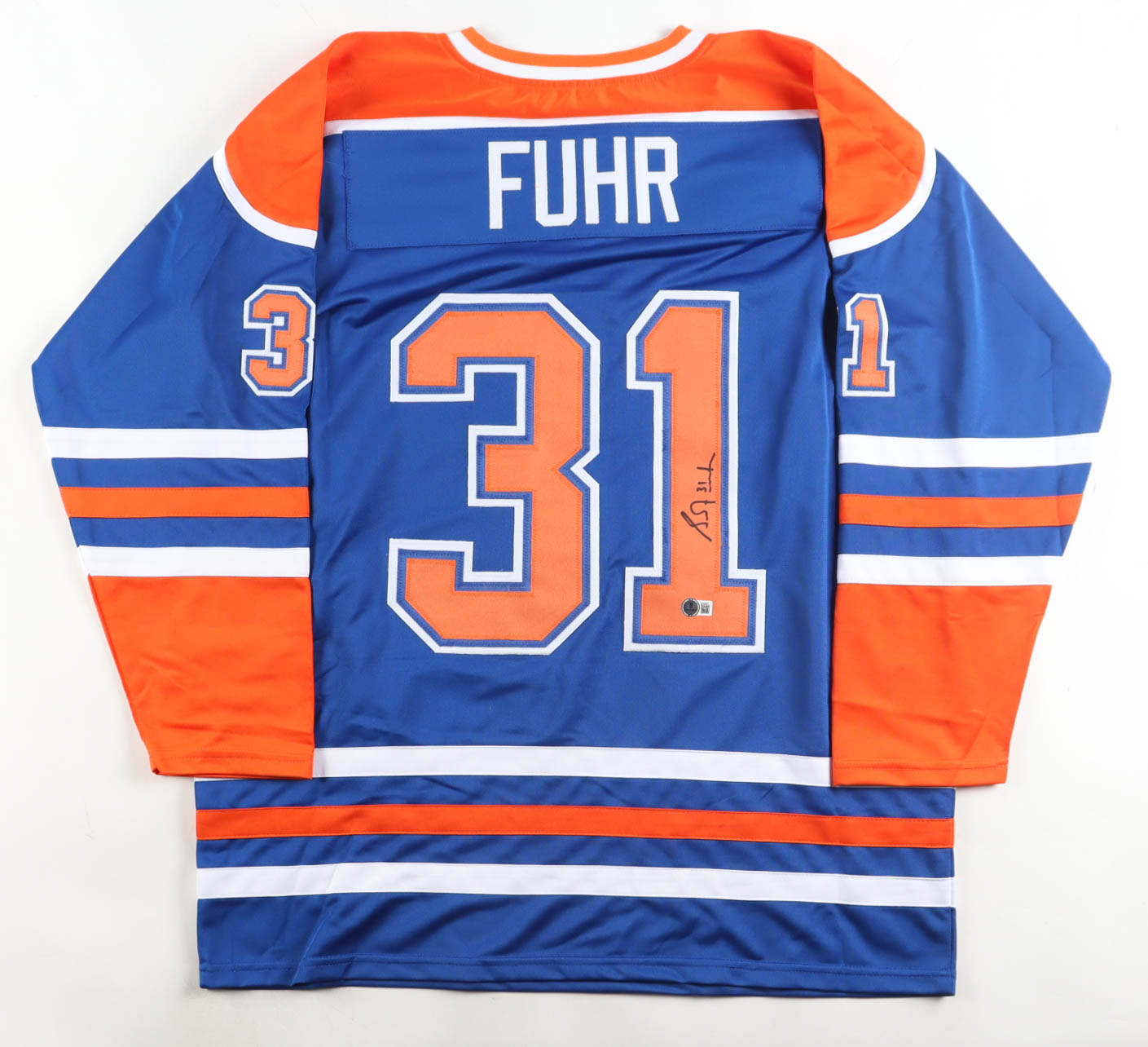 Custom jersey with everything sewn on, size XL. Hand-signed and inscribed by Grant Fuhr (HOF).