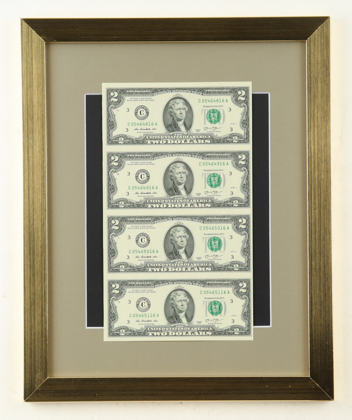 Custom frame measures approximately 13" x 16" in size and features an uncut sheet of (4) 2013 U.S. $2 dollar bills. Please note, the display is unsigned.
