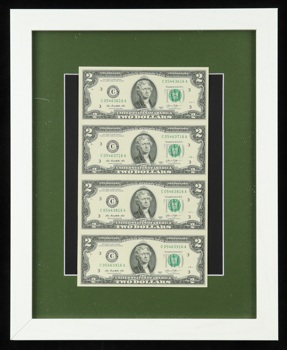 Custom frame measures approximately 13" x 16" in size and features an uncut sheet of (4) 2013 U.S. $2 dollar bills. Please note, the display is unsigned.