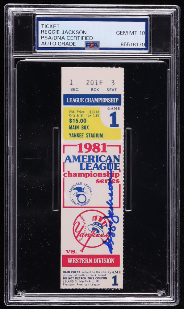 1981 Original ALCS Game ticket has been hand-signed by Reggie Jackson (New York Yankees, HOF) and graded (PSA Auto Gem MT 10). Please see photos for details regarding the item.