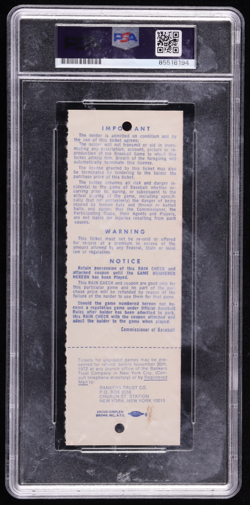 1972 Original World Series Game ticket has been hand-signed by Reggie Jackson (New York Yankees, HOF) and graded (PSA Auto Gem MT 10). Please see photos for details regarding the item.