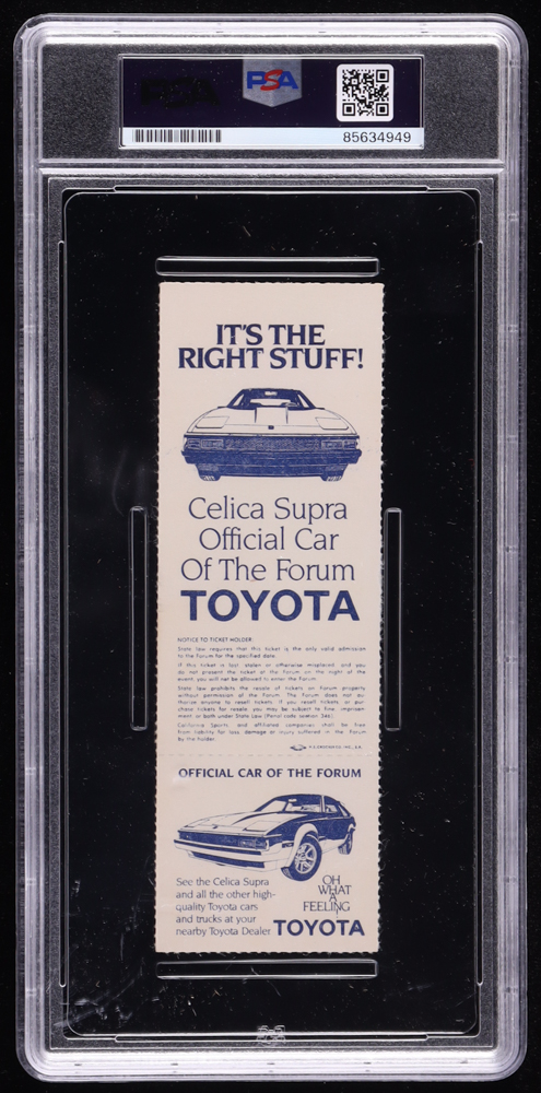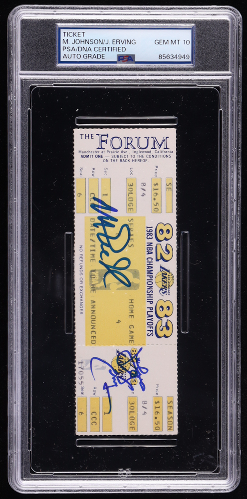 1982 Championship Playoffs ticket has been hand-signed by Magic Johnson (Los Angeles Lakers, HOF) and Julius Irving (Philadelphia 76ers, HOF) and graded (PSA 10). Please see photos for details regarding the item.