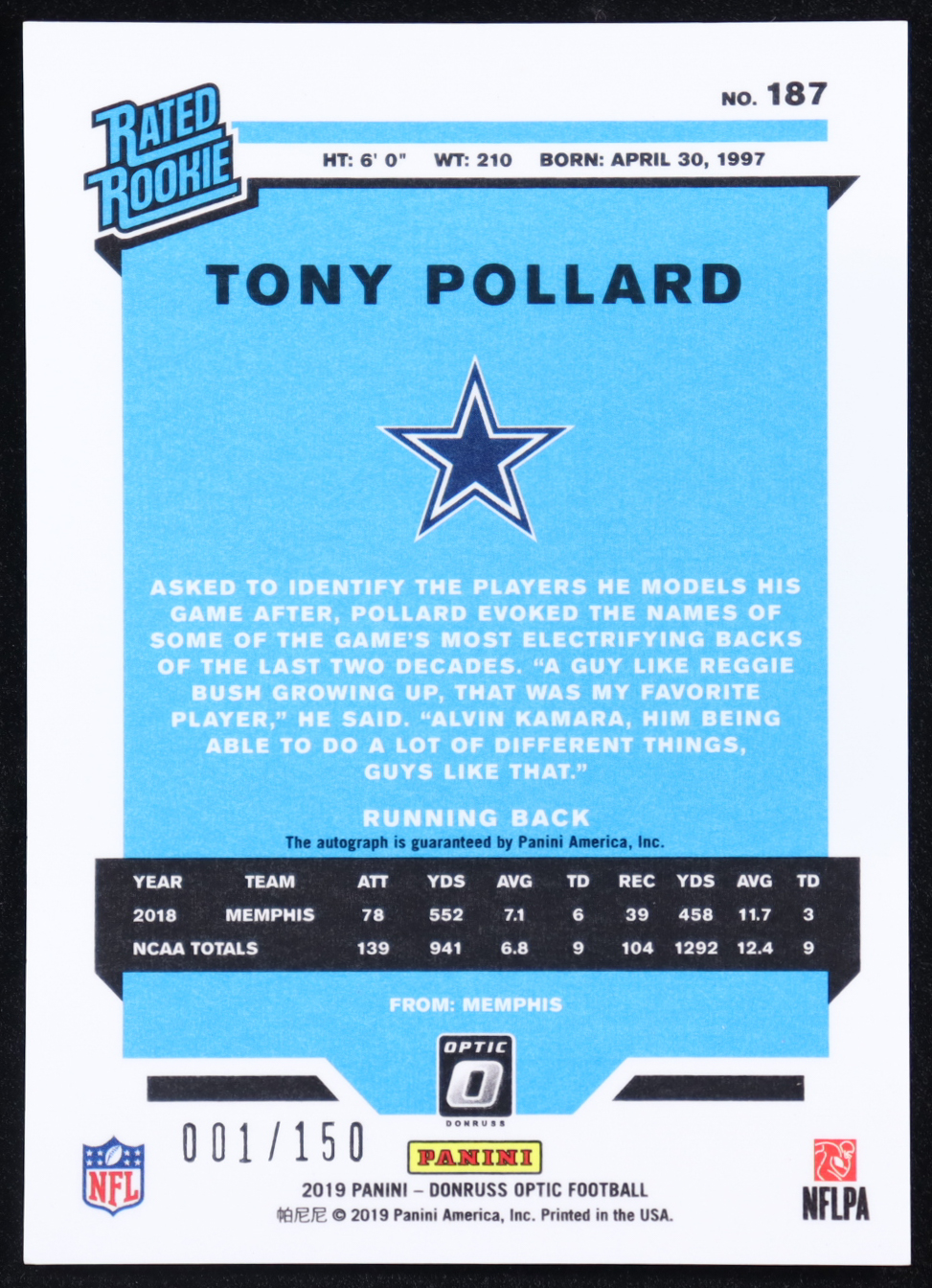 Tony Pollard 2019 Donruss Optic Rated Rookies Autographs #187 #001/150 RR RC