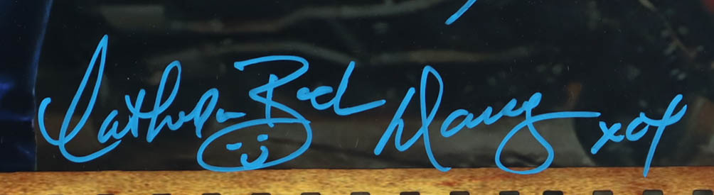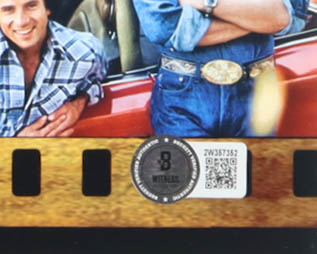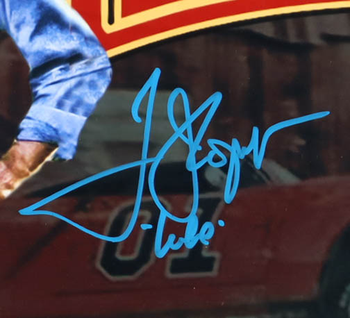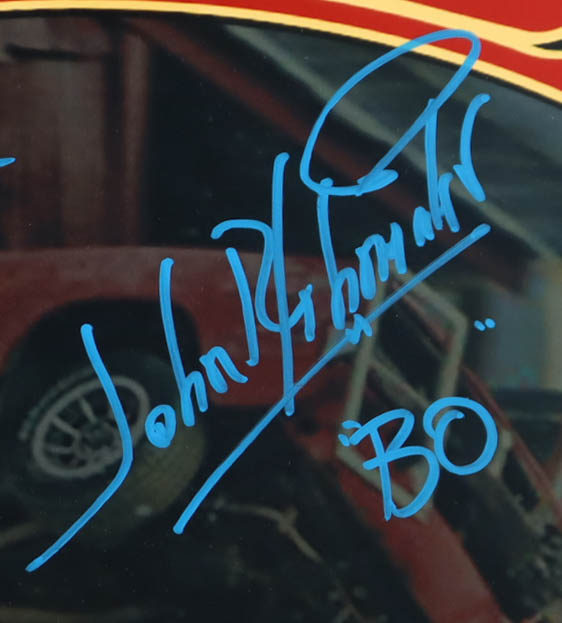 Photo measures 16" x 20" in size. Hand-signed and inscribed by John Schneider (Bo Duke), Catherine Bach (Daisy Duke), and Tom Wopat (Luke Duke).