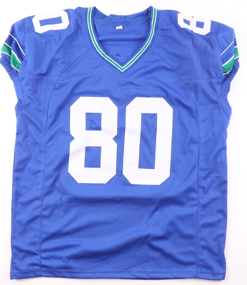 Custom jersey with everything sewn on, size XL. Hand-signed and inscribed by Steve Largent (HOF).