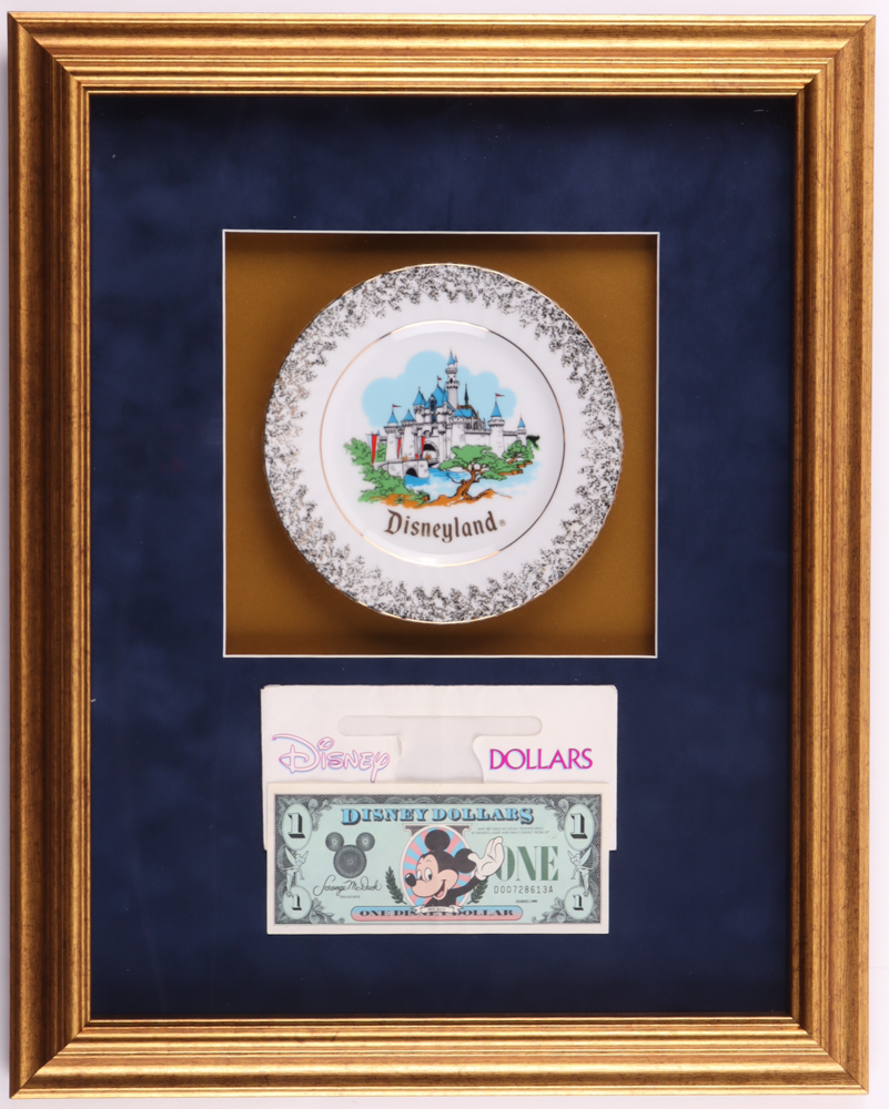 Custom frame measures approximately 16" x 20" in size and features a vintage Disneyland ceramic plate. Display also includes a vintage 1988 Disney dollar. Please see photos for more details regarding the condition of the item. Note that the item is unsigned.