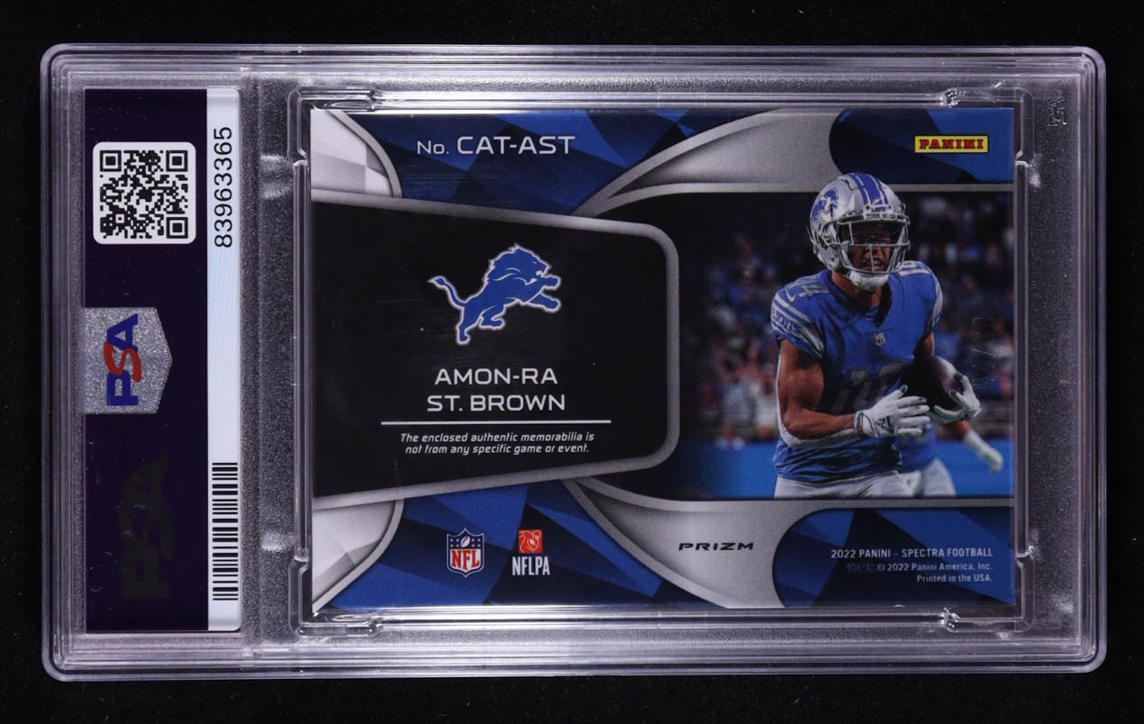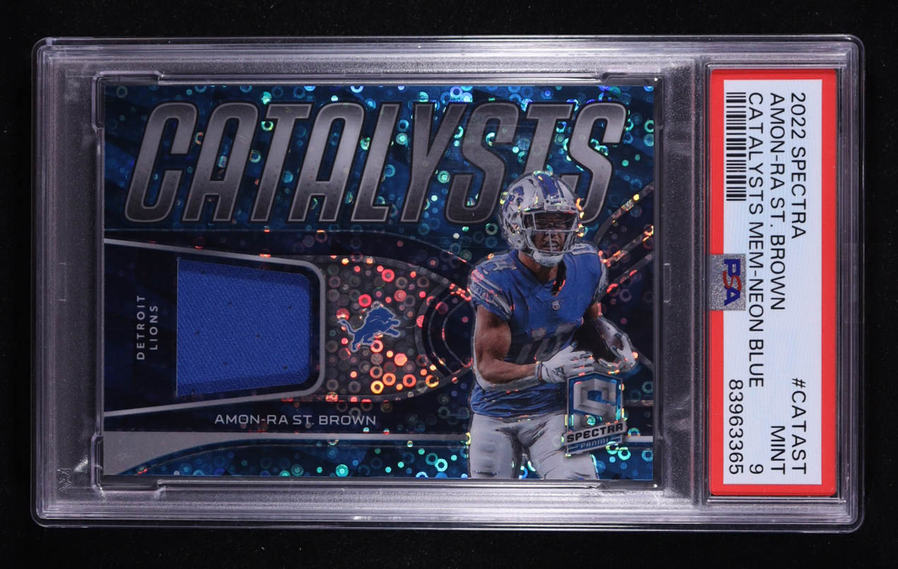 Amon-Ra St. Brown 2022 Panini Spectra Catalysts Materials Neon Blue #22 #04/60 (PSA 9)