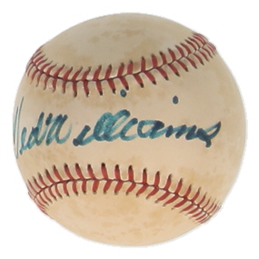 Rawlings Official American League Baseball. Hand-signed by Ted Williams (D. 2002, Boston Red Sox, HOF). Please note, the baseball is naturally toned and stained.