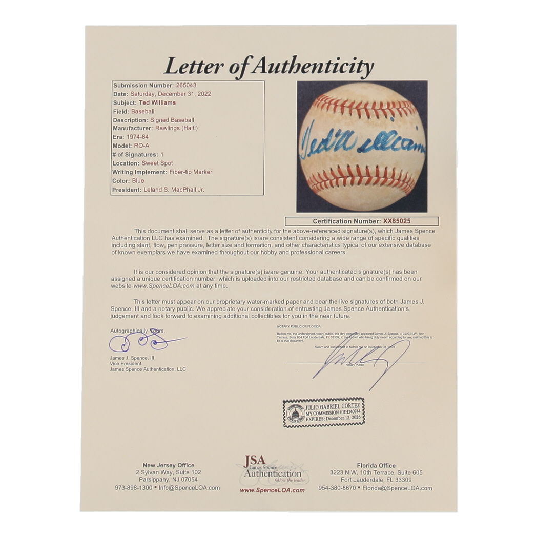 Ted Williams Signed OAL Baseball (JSA)