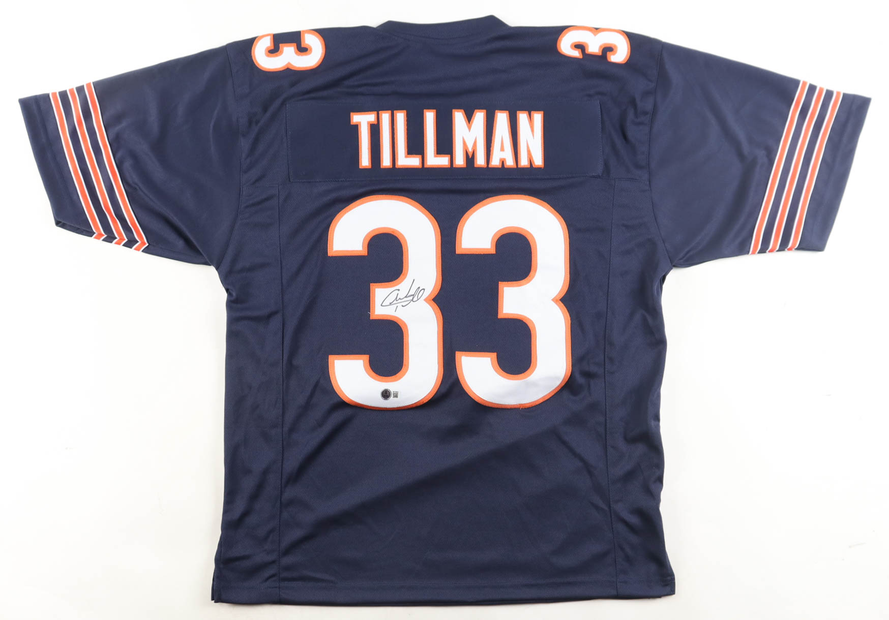 Custom jersey with everything sewn on, size XL. Hand-signed by Charles Tillman.