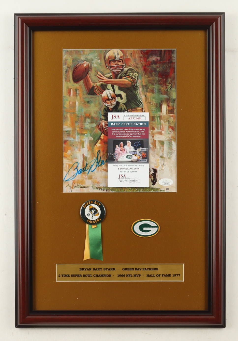 Frame measures approximately 16" x 16" in size. Featuring an 8" x 10" art print that has been hand-signed by Bar Starr (D. 2019, Green Bay Packers, HOF). Display also includes a vintage ribbon lapel pin and a Packers patch. Please see photos for details regarding the condition of the item.