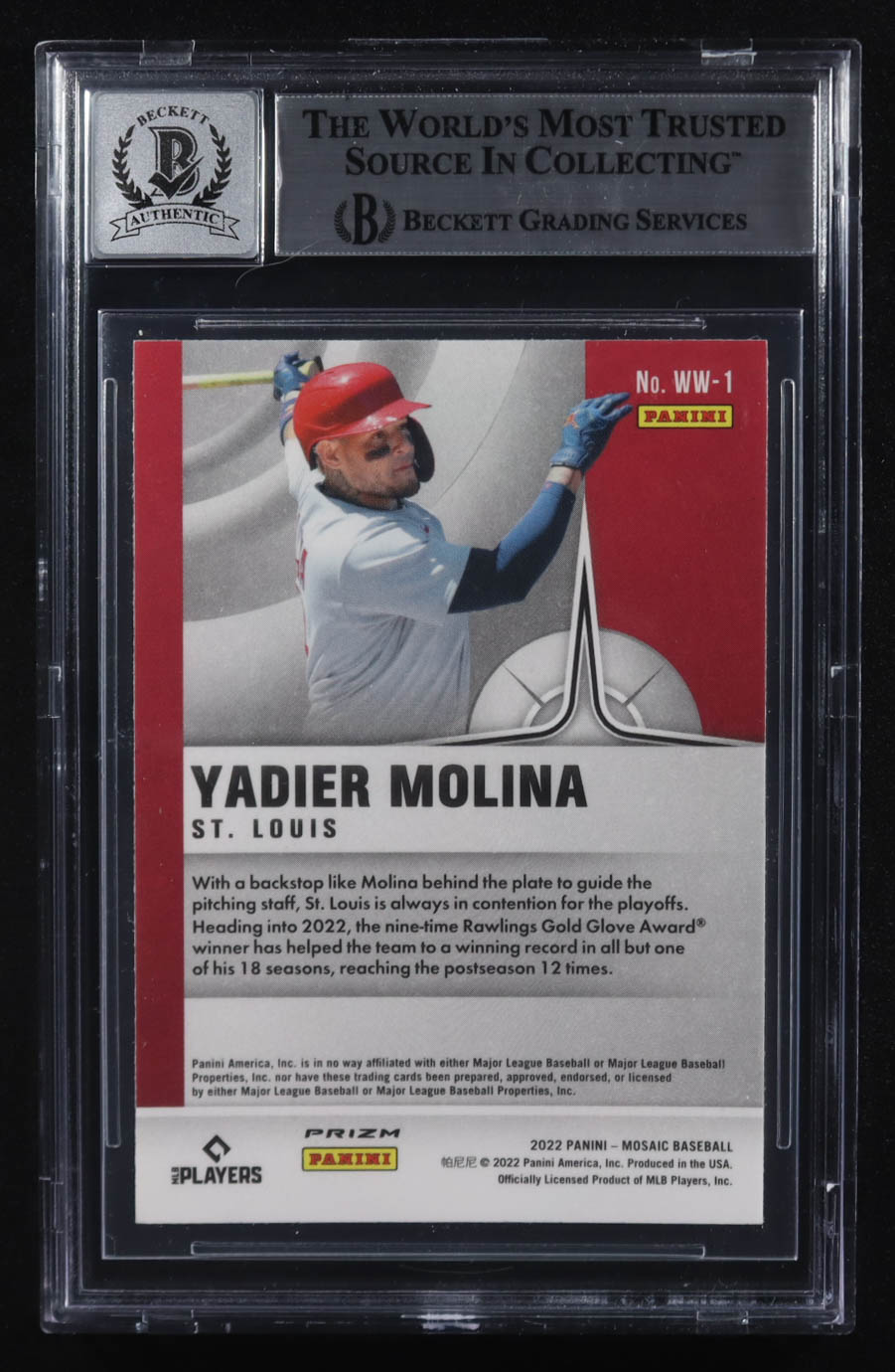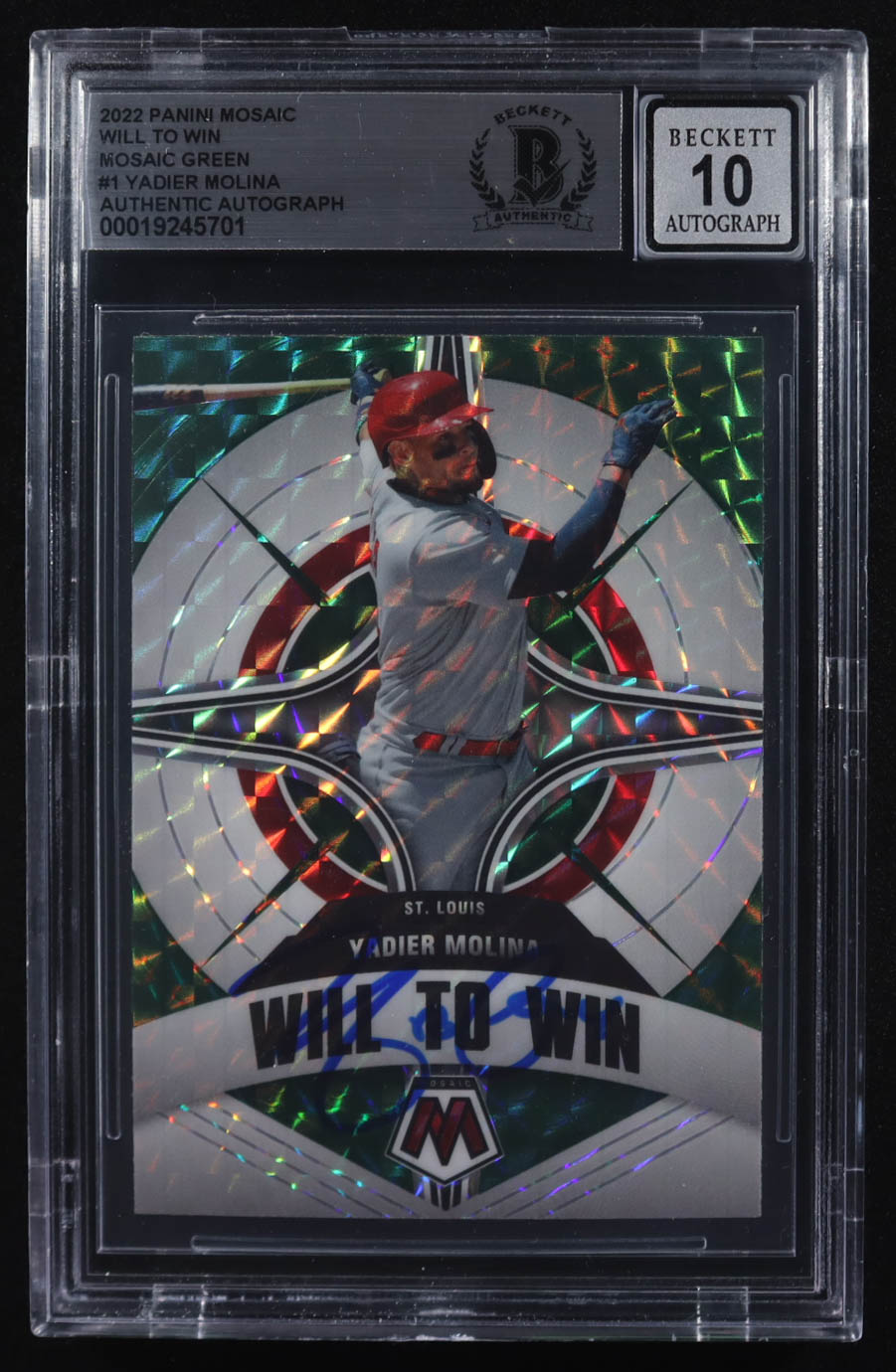 Yadier Molina Signed 2022 Panini Mosaic Will to Win Mosaic Green #1 (BGS)