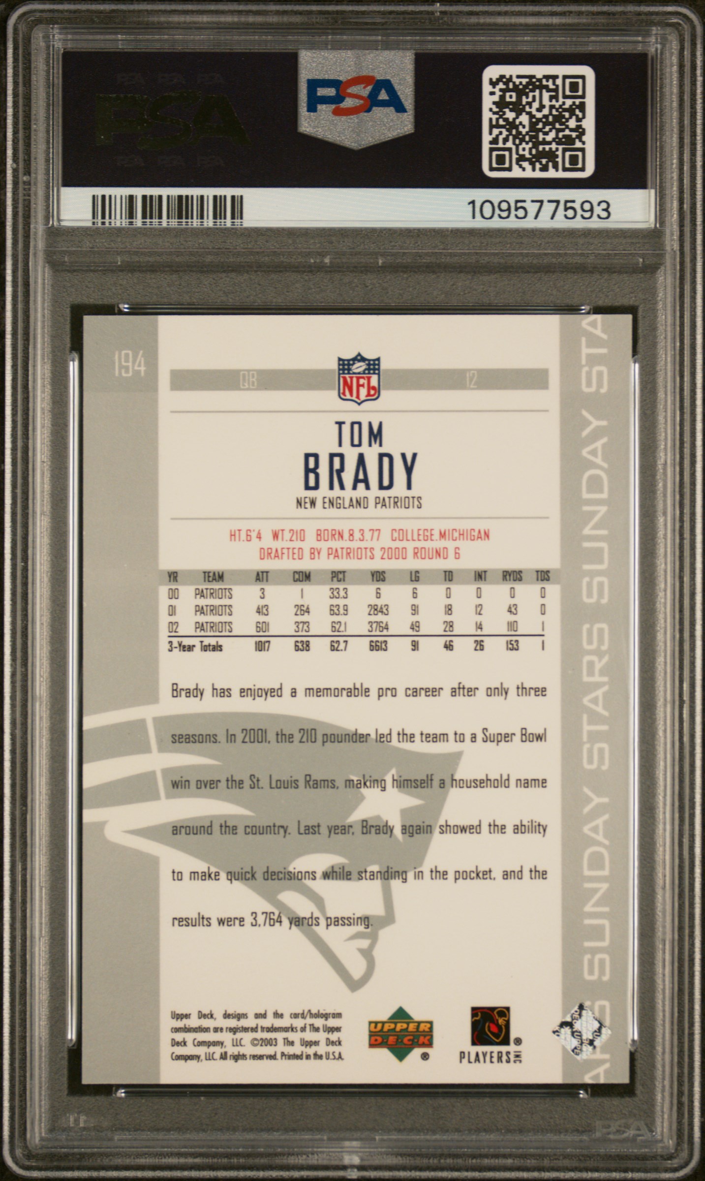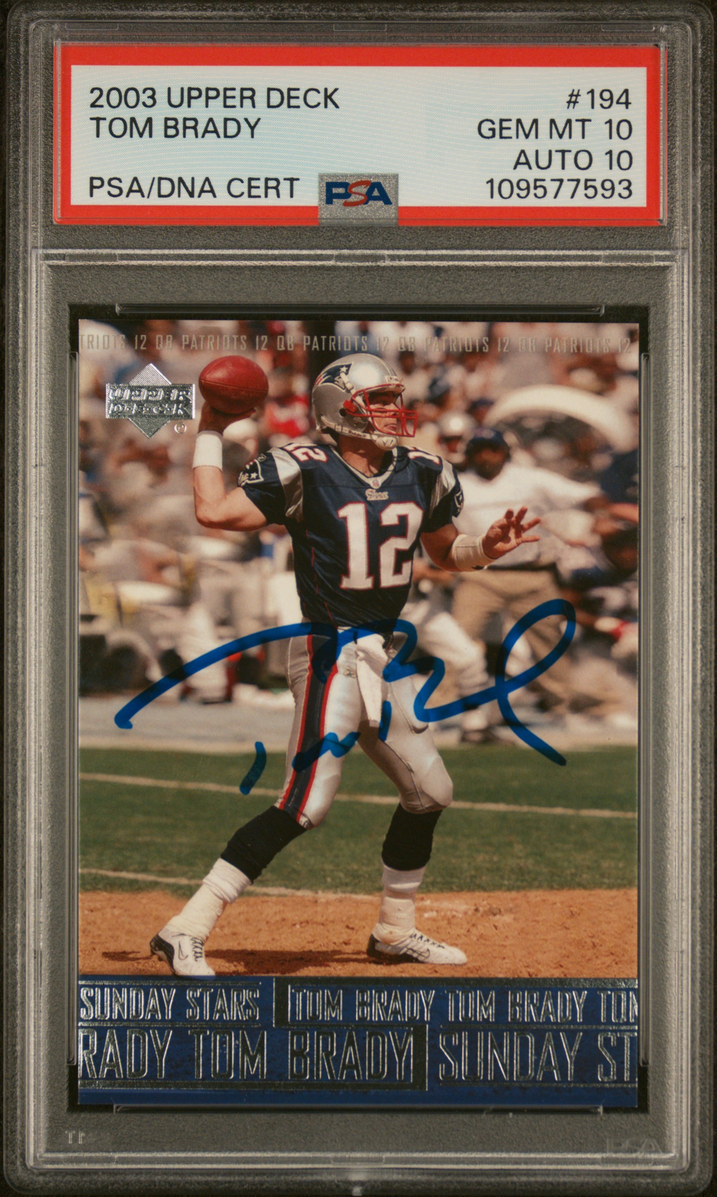 Tom Brady Signed 2003 Upper Deck #194 (PSA 10 | Autograph Grade 10)