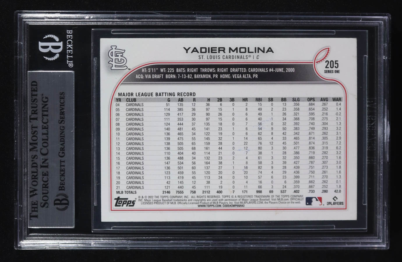 Yadier Molina Signed 2022 Topps #205 (BGS)