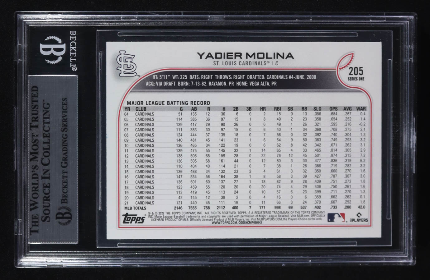 Yadier Molina Signed 2022 Topps #205 (BGS)