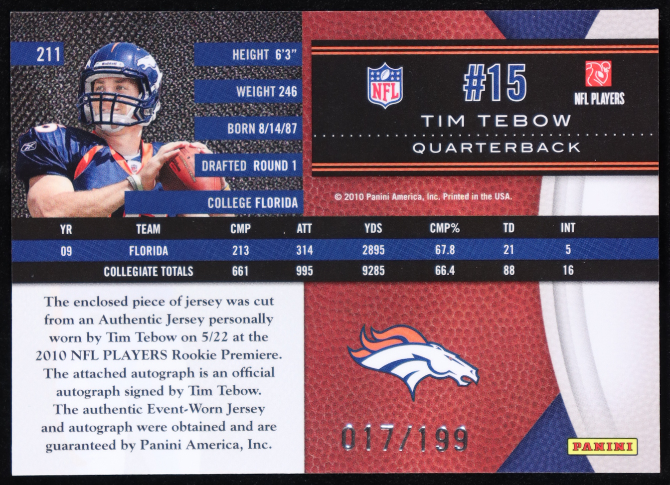 Tim Tebow 2010 Limited Autographs Player-Worn JSY #211#017/199 RC
