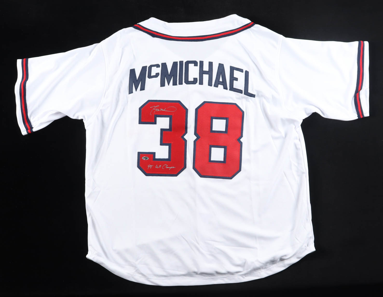 Custom jersey. Everything is sewn on, size XL. Hand-signed and inscribed by Greg McMichael.