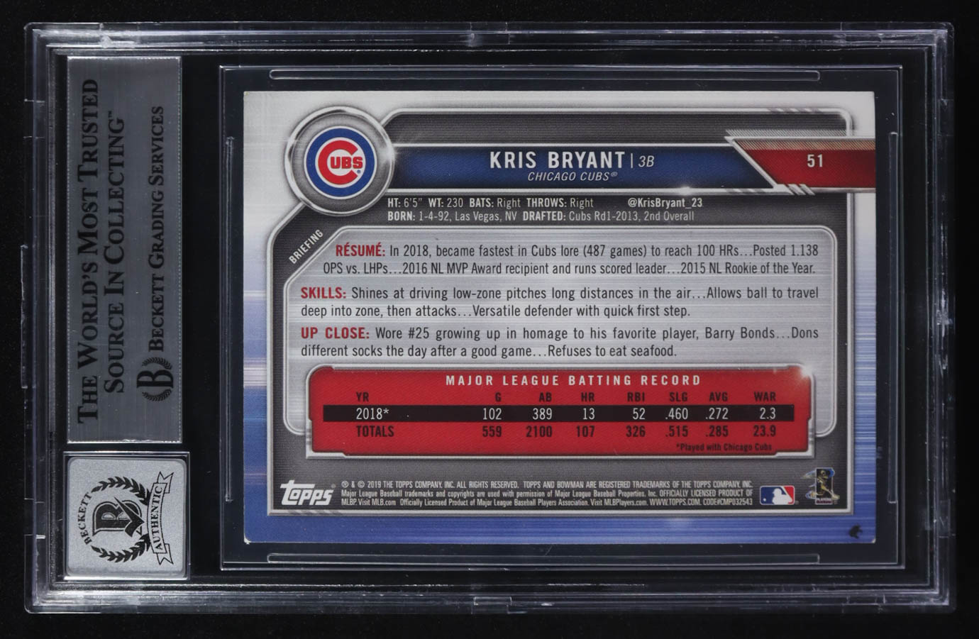 Kris Bryant Signed 2019 Bowman #51 (BGS)