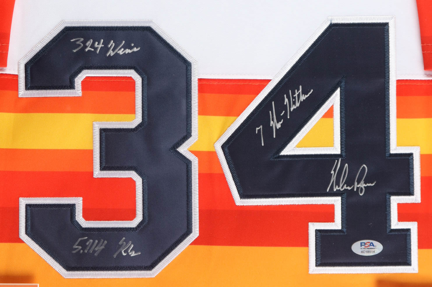 Nolan Ryan Signed Custom Framed Jersey Display Inscribed "324 Wins, 5714 K's & 7 No-Hitters" with 1999 HOF Induction Pin (PSA)