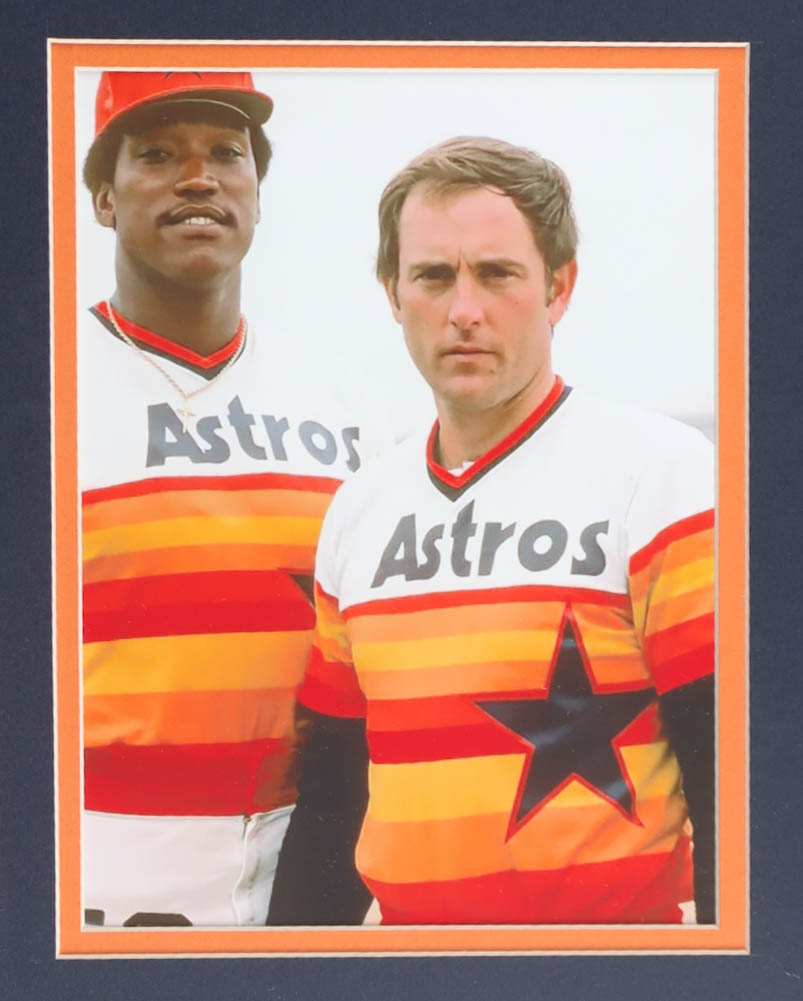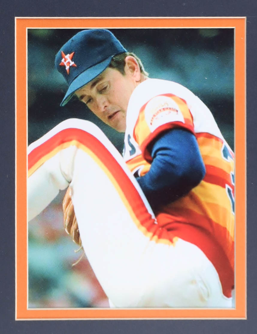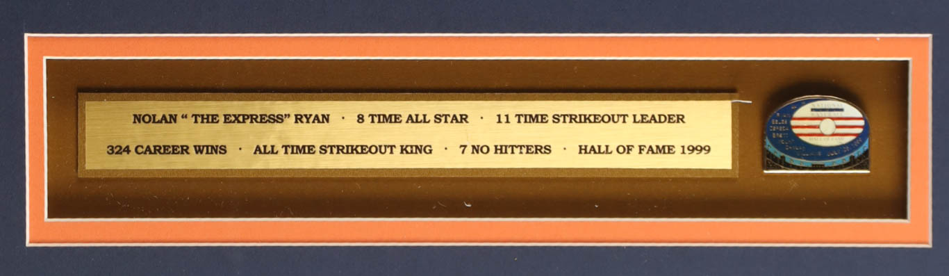 Custom frame display measures approximately 32" x 36" in size and features a jersey that has been hand-signed and inscribed by Nolan Ryan (Houston Astros, HOF). The display also includes a 1999 vintage baseball hall of fame pin, (2) photos, (2) metal team logo emblems and a career statistics plaque.