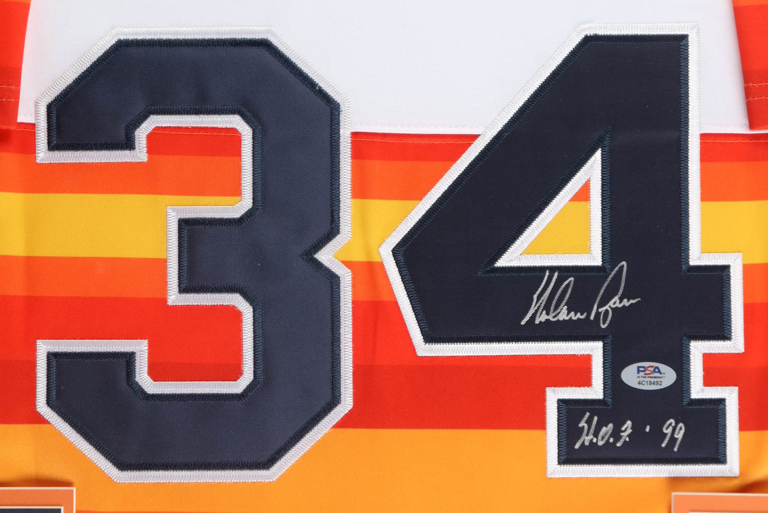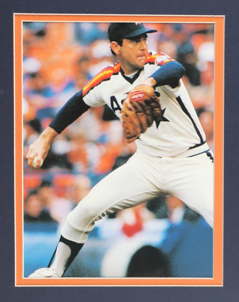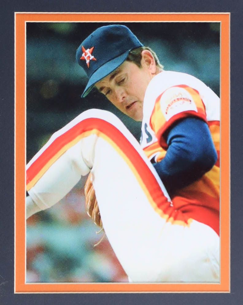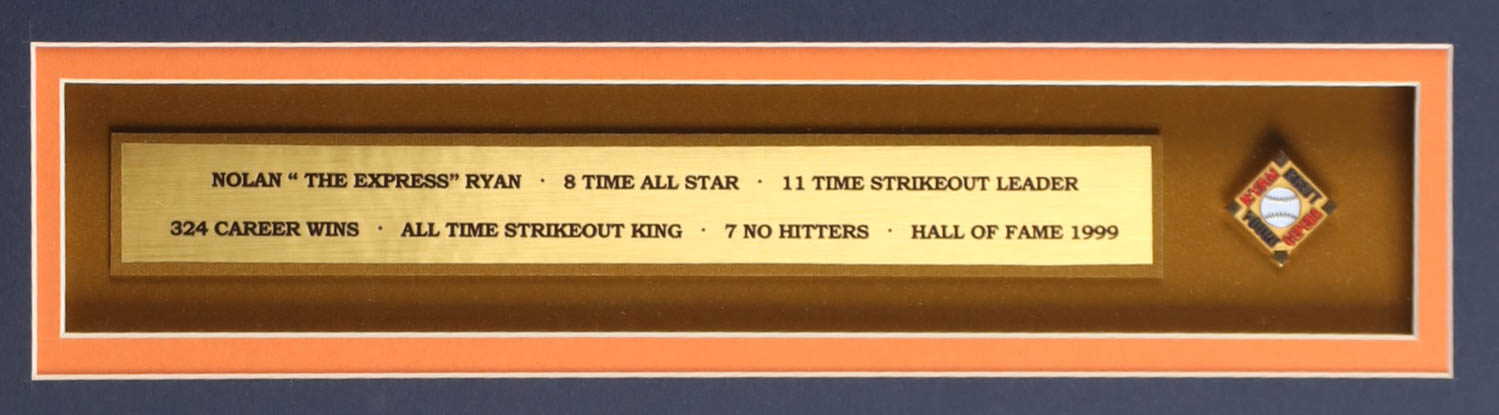 Custom frame display measures approximately 32" x 36" in size and features a jersey that has been hand-signed and inscribed by Nolan Ryan (Houston Astros, HOF). The display also includes a 1999 vintage baseball hall of fame pin, (2) photos, (2) metal team logo emblems and a career statistics plaque.