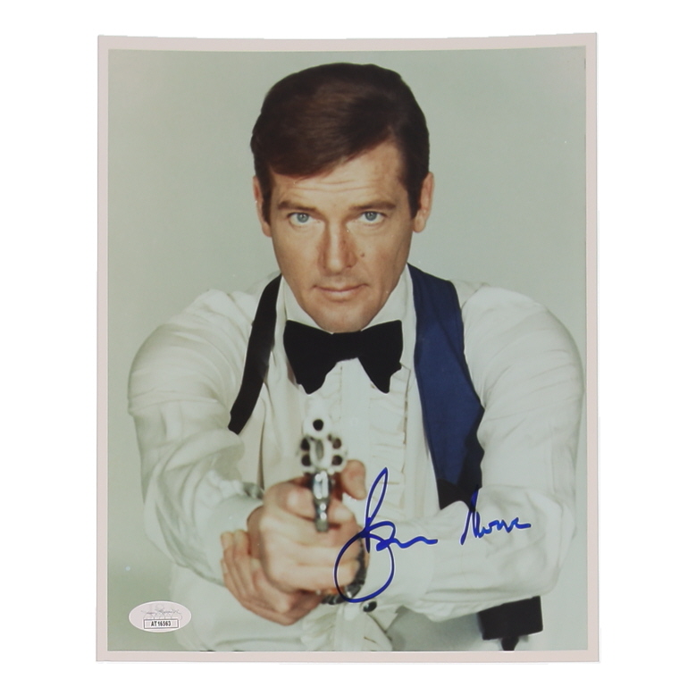 Photograph measures approximately 8" x 10" in size. Hand-signed by Roger Moore.