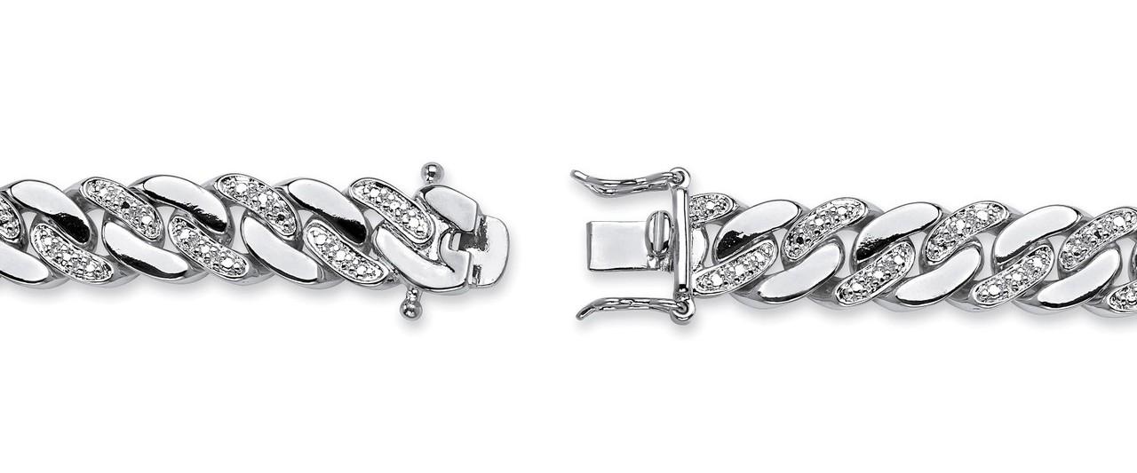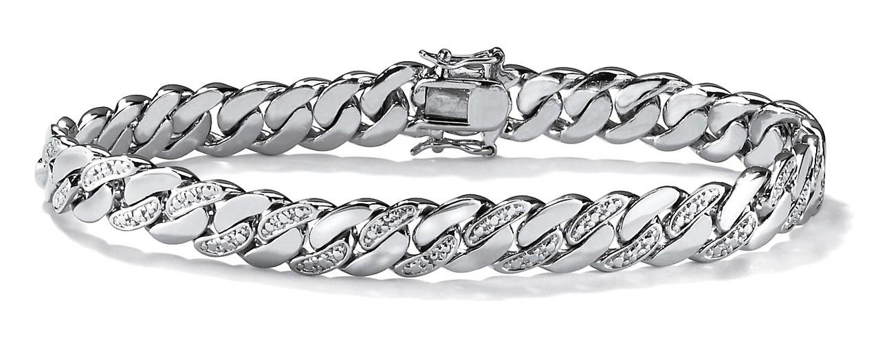 Mens curb link bracelet with diamond accents set in platinum over brass. Designed with a bold contemporary profile, this 9.5 inch bracelet features polished curb links highlighted by two round genuine diamond accents for subtle brilliance. Finished with a secure box clasp.