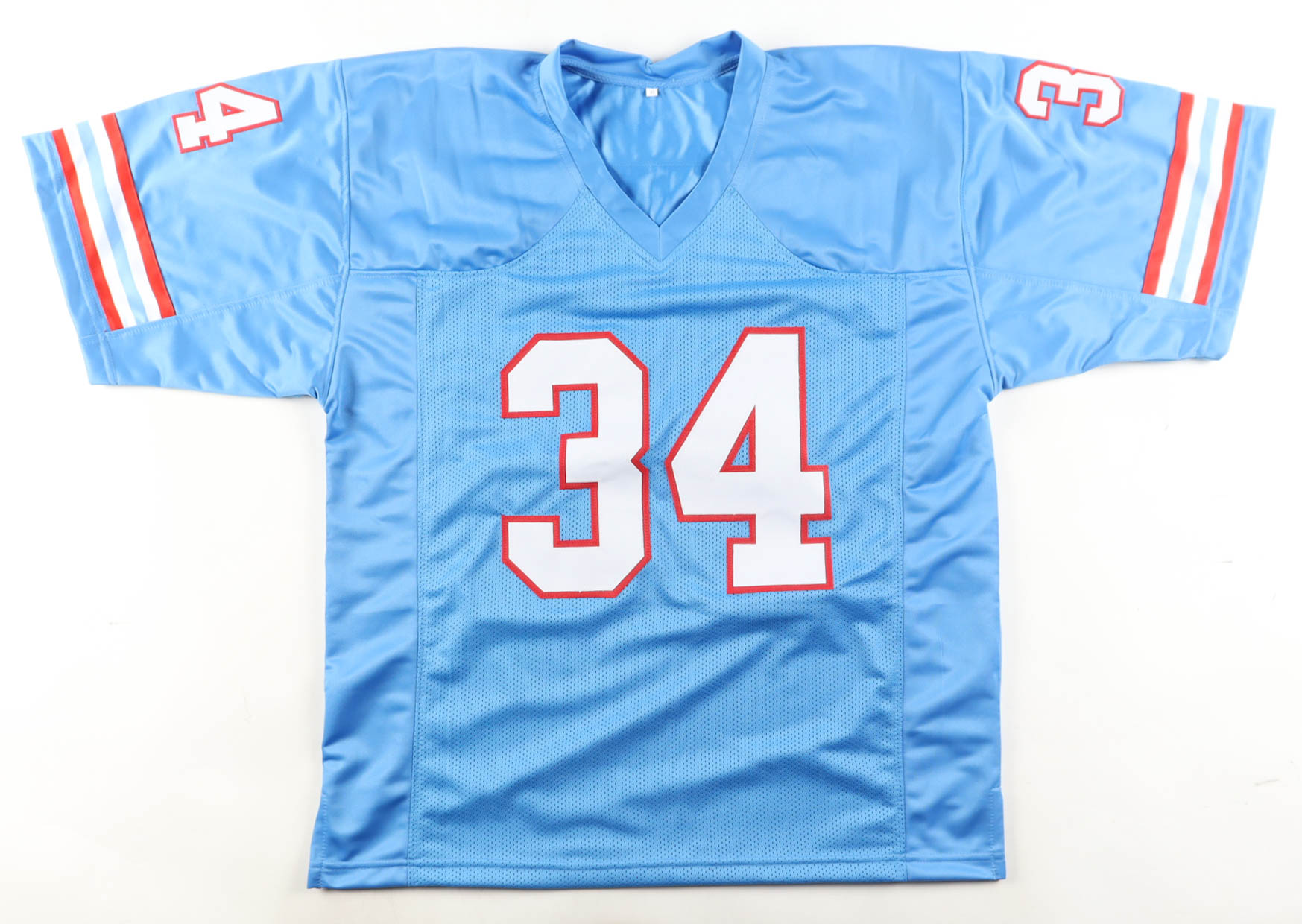 Custom jersey with everything sewn on, size XL. Hand-signed and inscribed by Earl Campbell (HOF). Please note, the signature and inscription have bled.