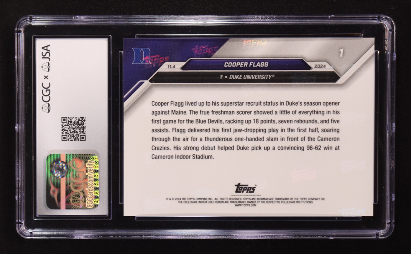 Card has been hand-signed by Cooper Flagg (Duke Blue Devils) and has been auto graded (CGC/JSA) Authentic. Please see photos for more details regarding the card.