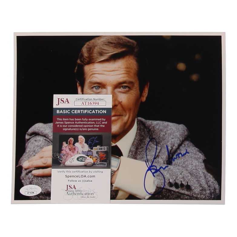 Photograph measures approximately 8" x 10" in size. Hand-signed by Roger Moore.