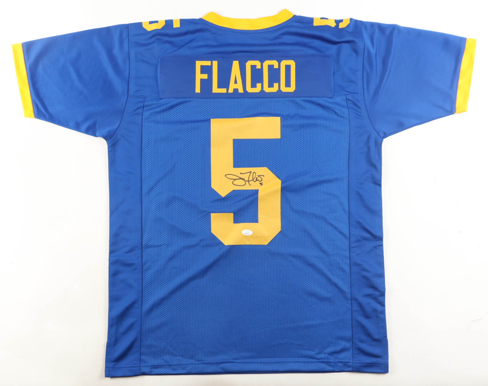 Custom jersey with everything sewn on, size XL. Hand-signed by Joe Flacco. Please note, glue is visible through the reverse number.