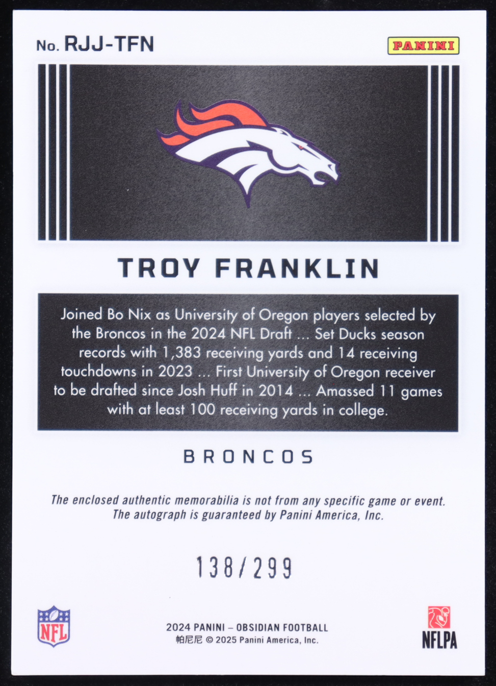 Troy Franklin 2024 Panini Obsidian Rookie Jumbo Jersey Autographs #213 #138/299