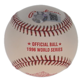 Rawlings Official 1996 World Series Baseball. Hand-signed and inscribed by Wade Boggs (New York Yankees, HOF). Please note, there are minor stains throughout the baseball.