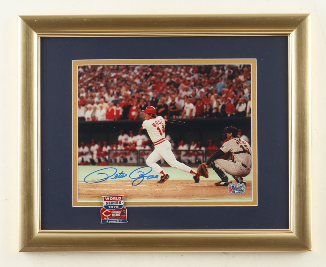 Pete Rose Signed Reds Custom Framed Photo Display with 1975 World Series Pin (Rose)