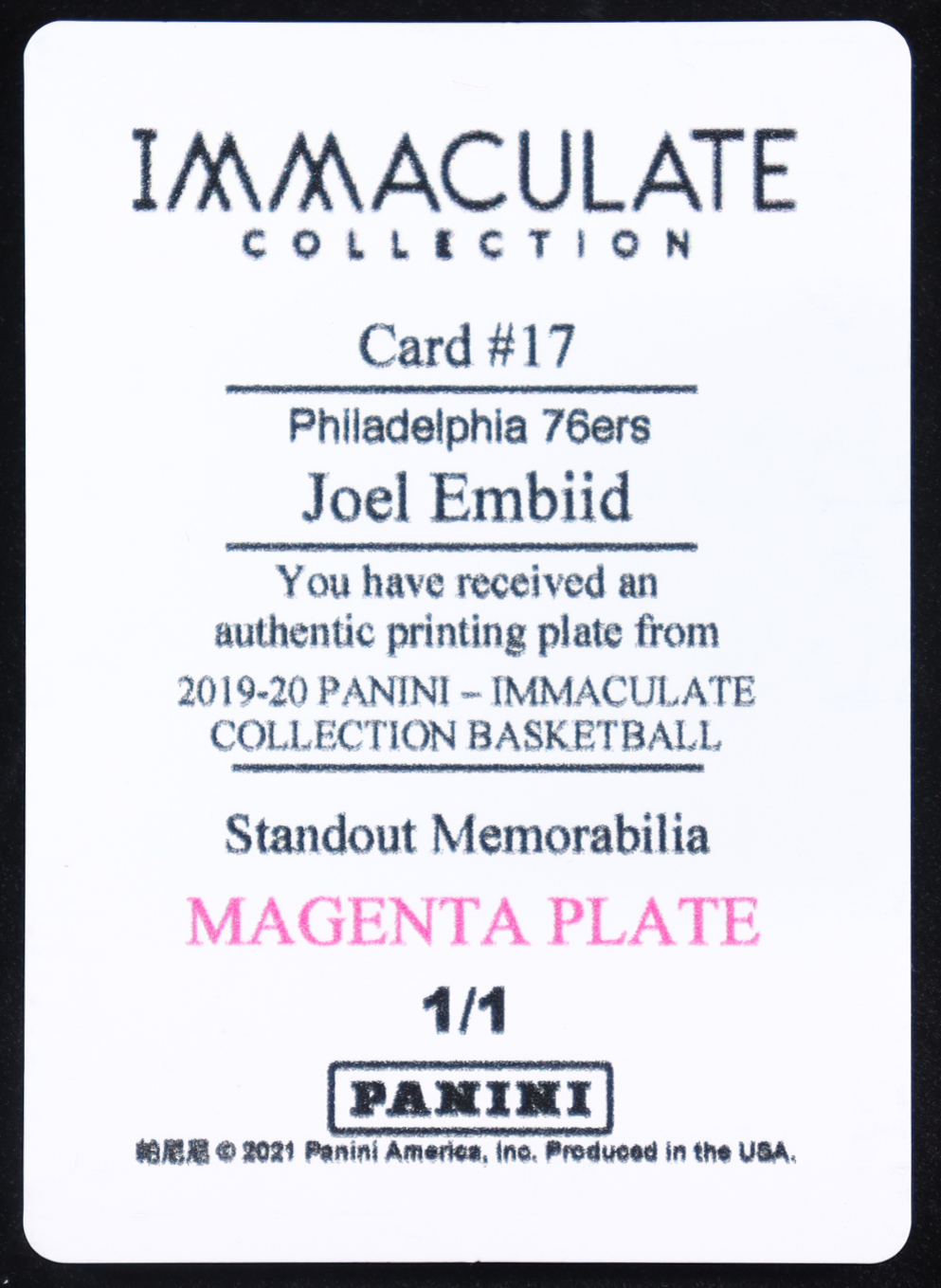 Joel Embiid 2019-20 Panini Immaculate Collection Magenta Plate Memorabilia #17 #1/1