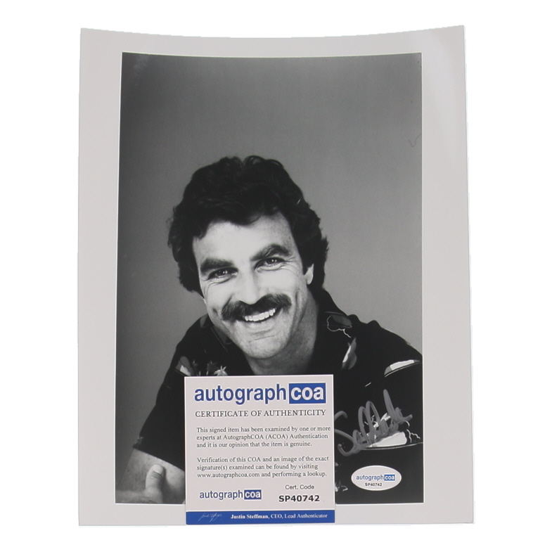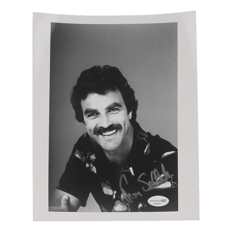 Photograph measures approximately 8" x 10" in size. Hand-signed by Tom Selleck.