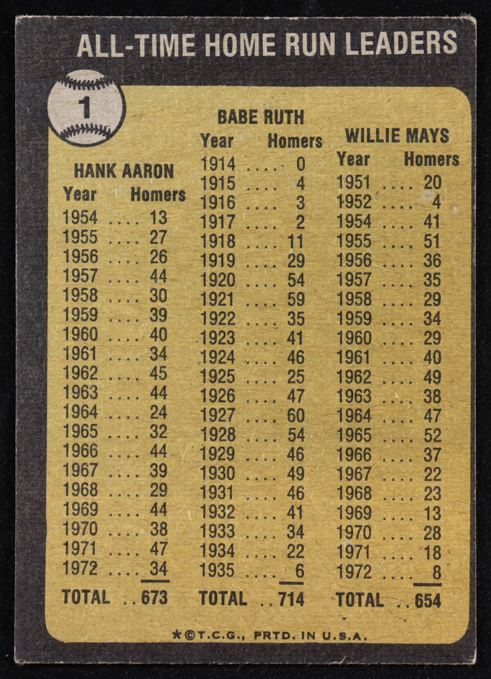 Babe Ruth / Hank Aaron / Willie Mays 1973 Topps All Time Home Run Leaders #1