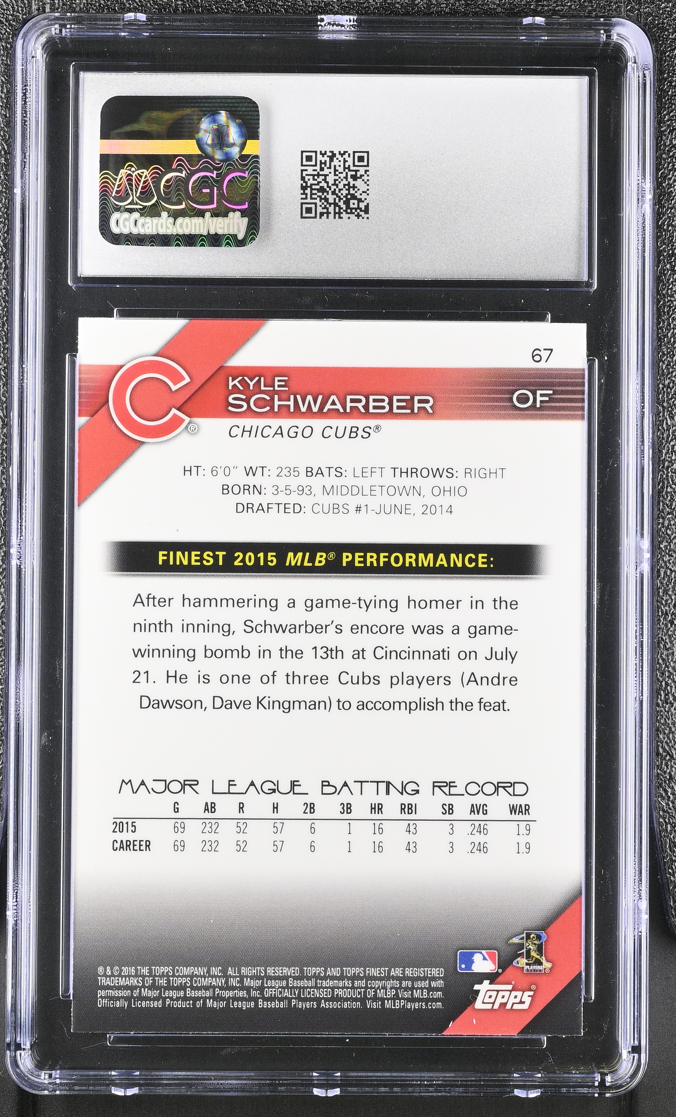 Kyle Schwarber 2016 Topps Finest Refractor #67 RC (CGC 9)