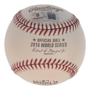 Rawlings Official 2016 World Series Logo Baseball. Hand-signed and inscribed by Mike Montgomery (Chicago Cubs). Please note there is a stain on the signature.