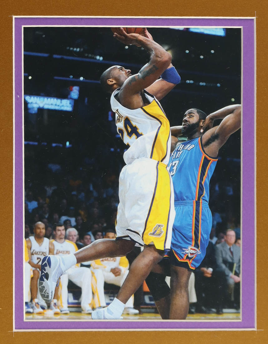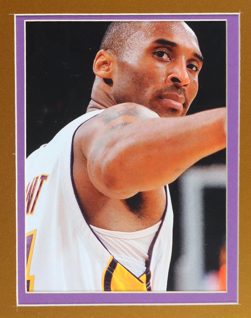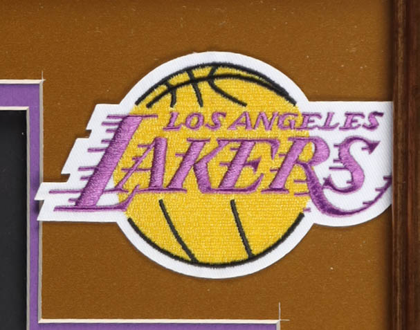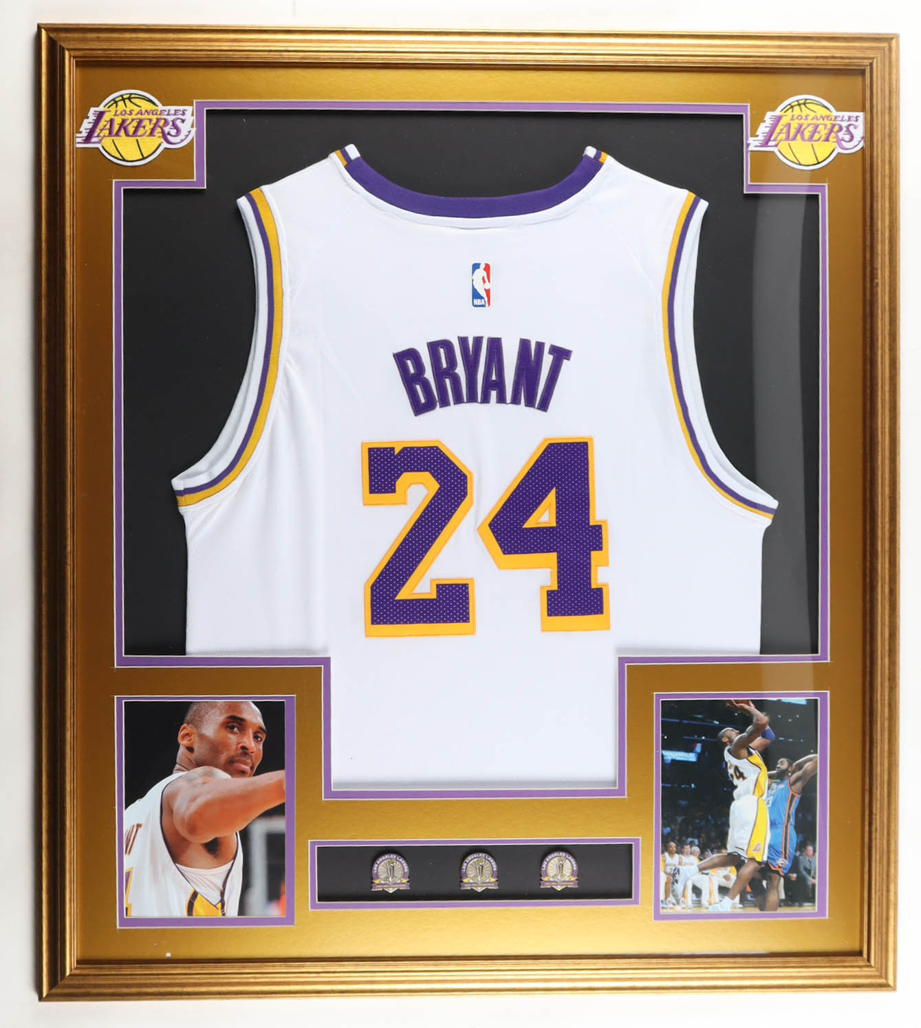Custom frame measures approximately 32" x 36" in size and features an unsigned Kobe Bryant (D. 2020, HOF) Jersey. The display also includes (2) 8" x 10" Photos, (2) Team Logo Patches and (3) NBA Finals Pins. Please note, the display is unsigned.