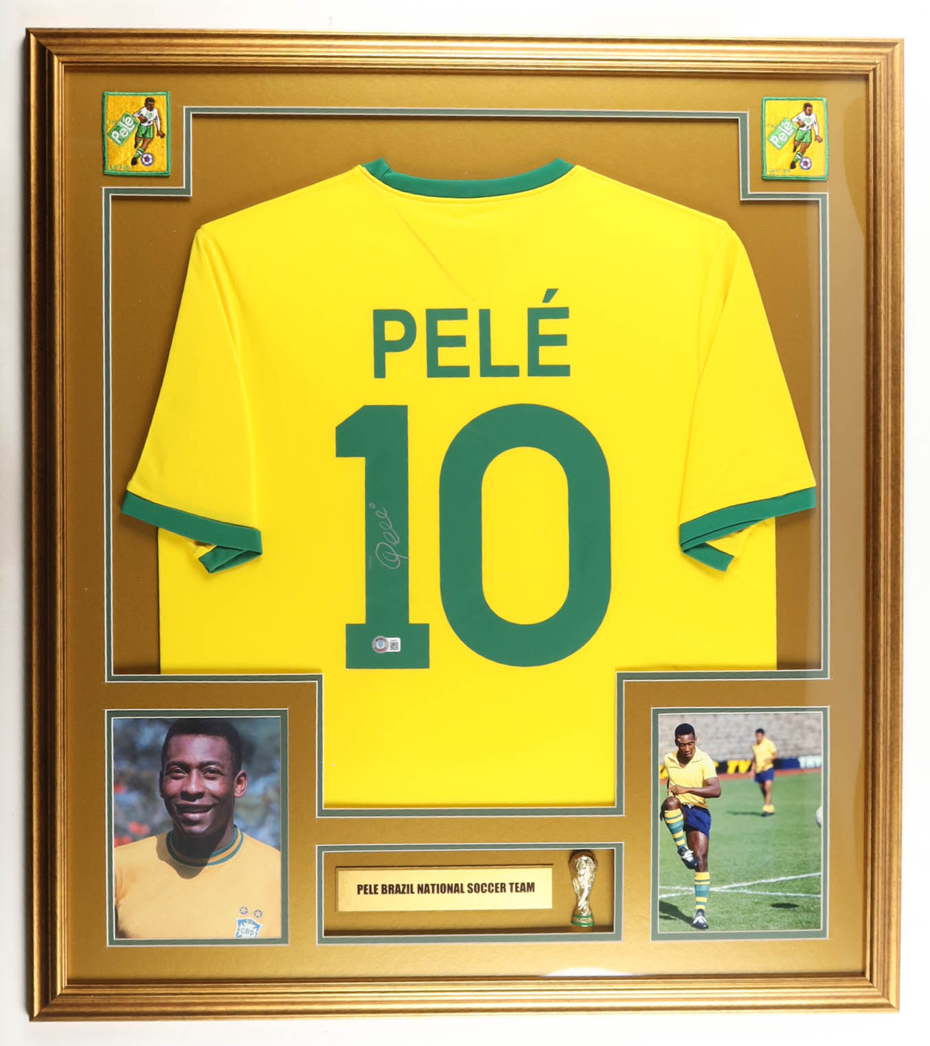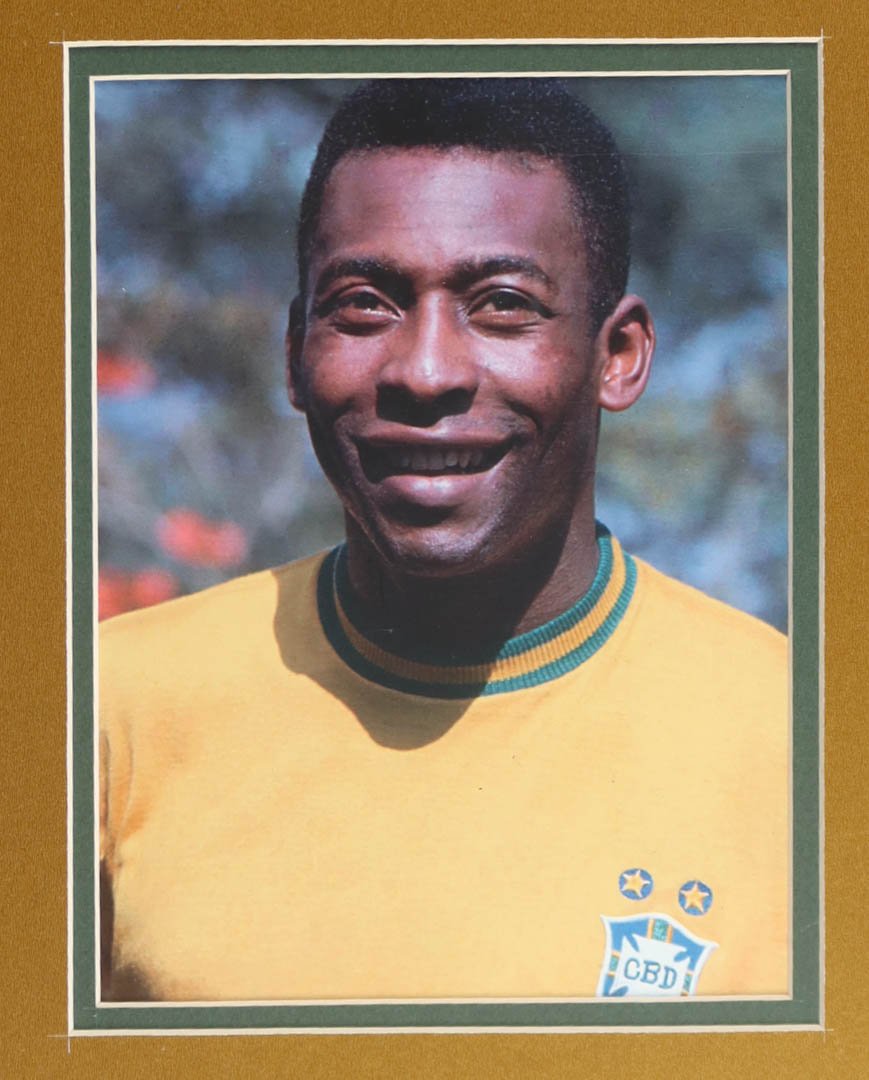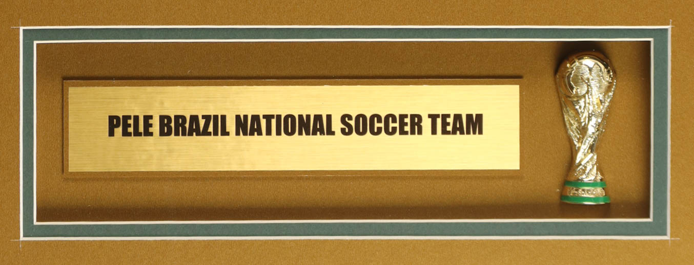 Custom frame measures 35" x 43" in size and features a jersey that has been hand-signed by Pele (D. 2022, HOF). Please note that the 8" x 10" photos may be in reverse order. Display also features a Trophy Pin and career statistics plaque and (2) cloth team logo patches.