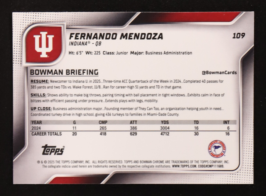 Fernando Mendoza 2025 Bowman Chrome University Xfractors #109 RC