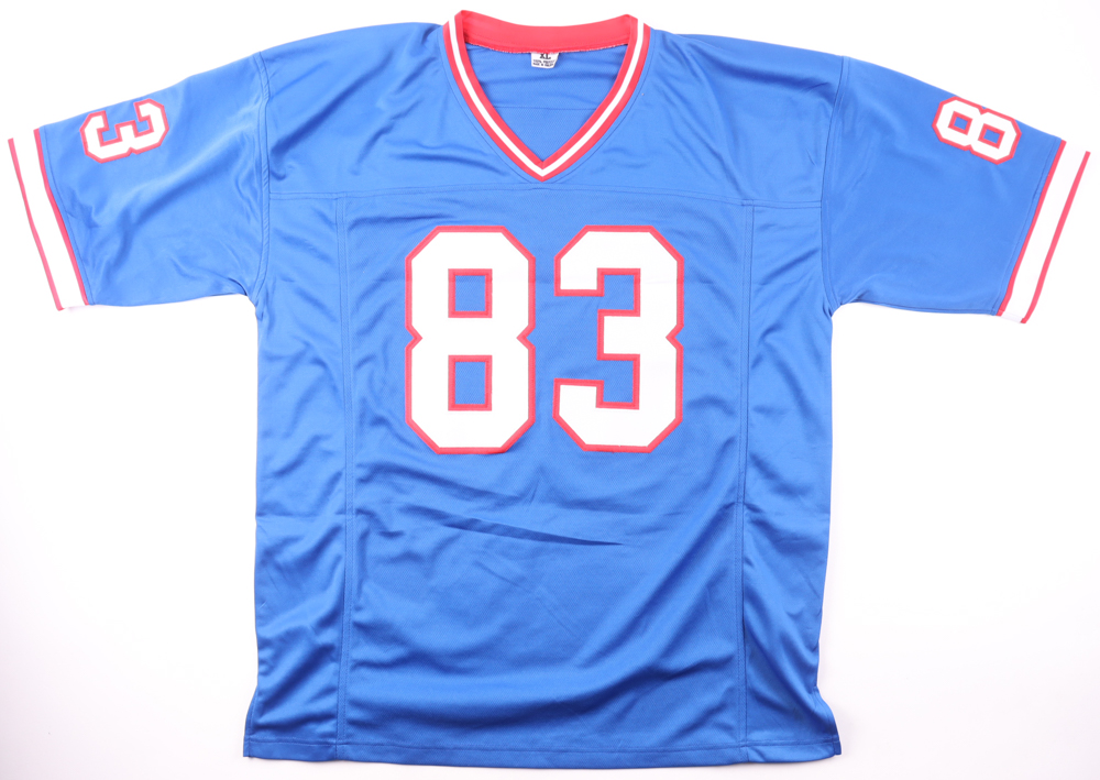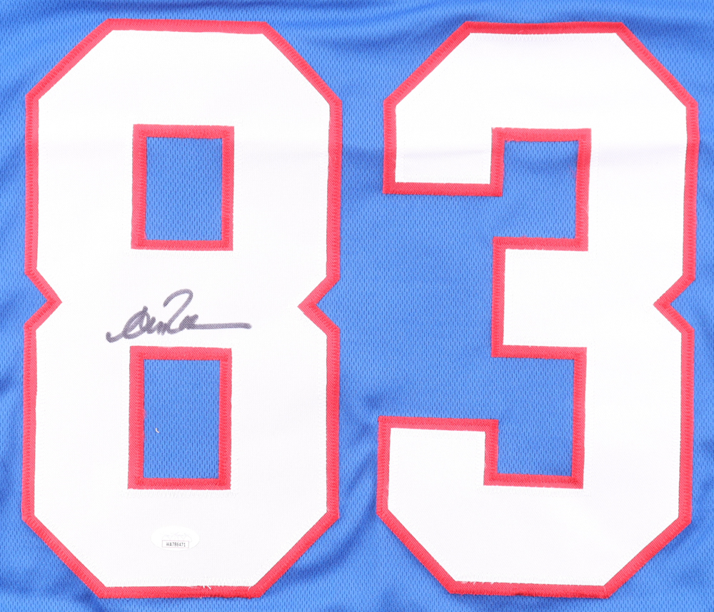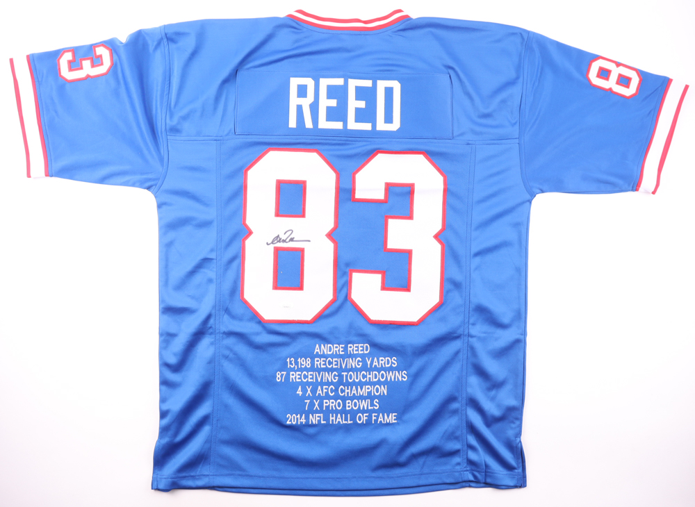 Custom jersey. Everything is sewn on, size XL. Hand-signed by Andre Reed (HOF). Reed's career highlights have been custom stitched onto the back of the jersey below the reverse numbers.