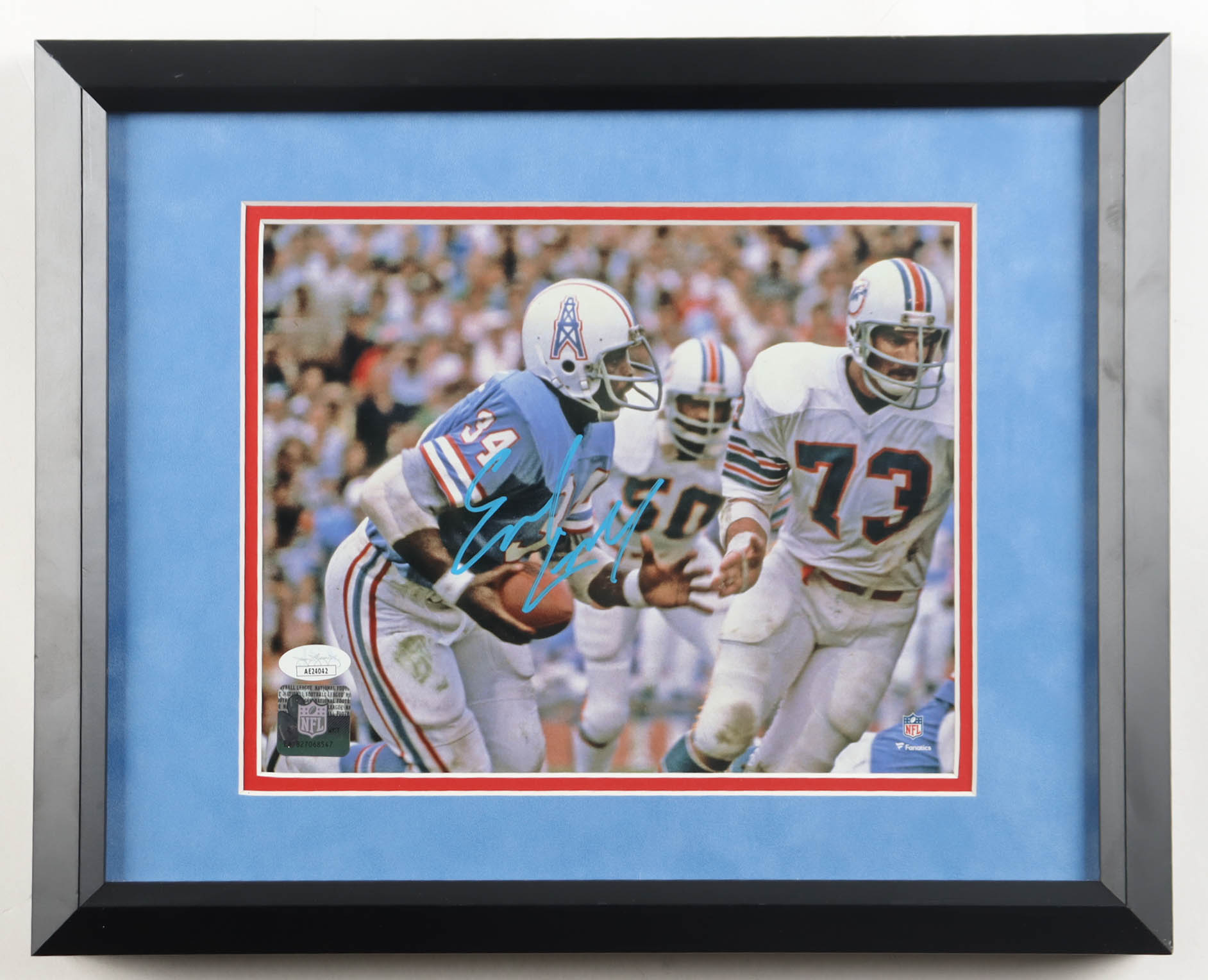 Custom frame measures 12.5" x 15.5" in size. Photograph is hand-signed by Earl Campbell (Houston Oilers).