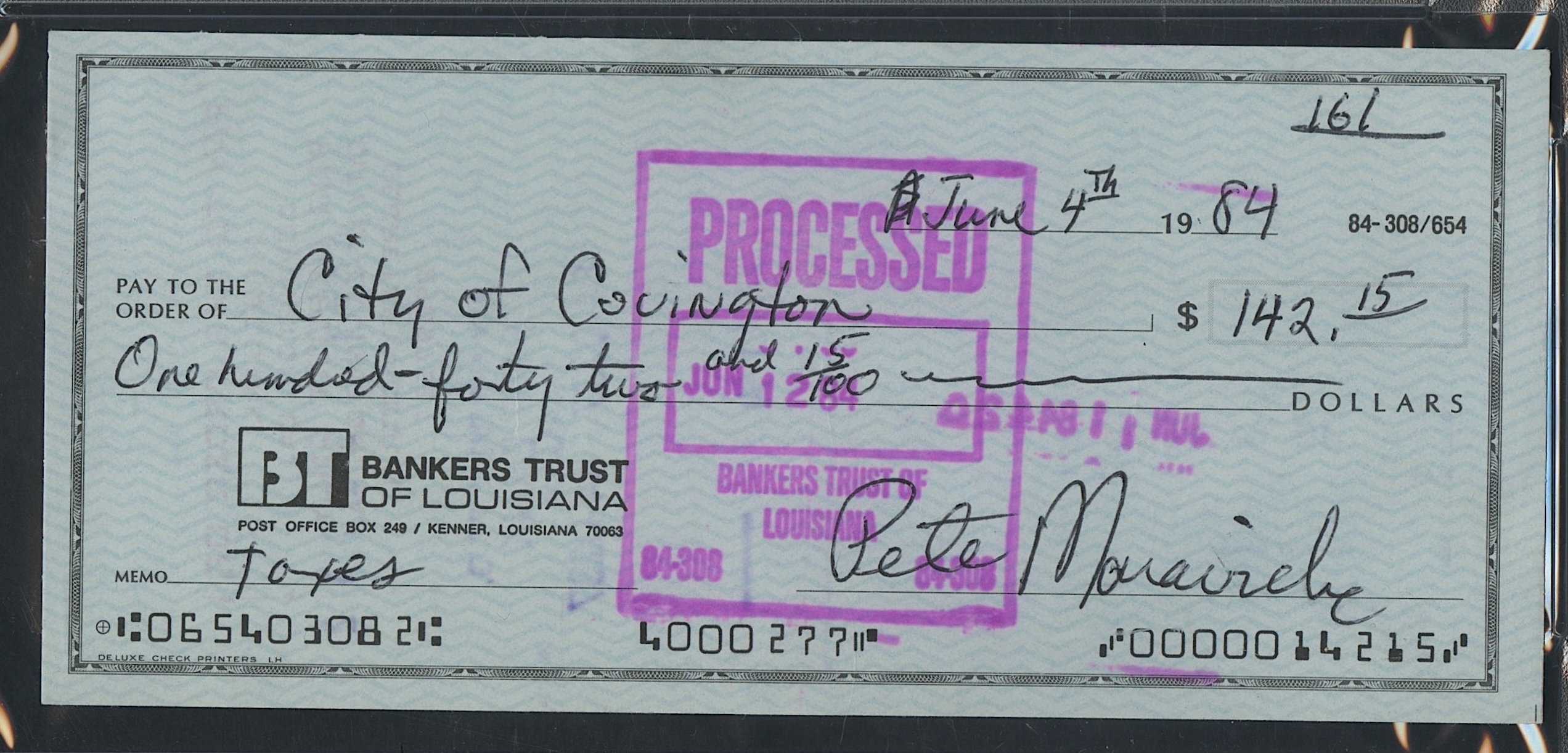 Personal bank check has been hand-signed and filled out by hand by Pete Maravich (D. 1988).