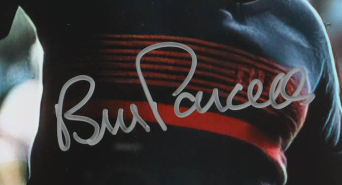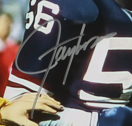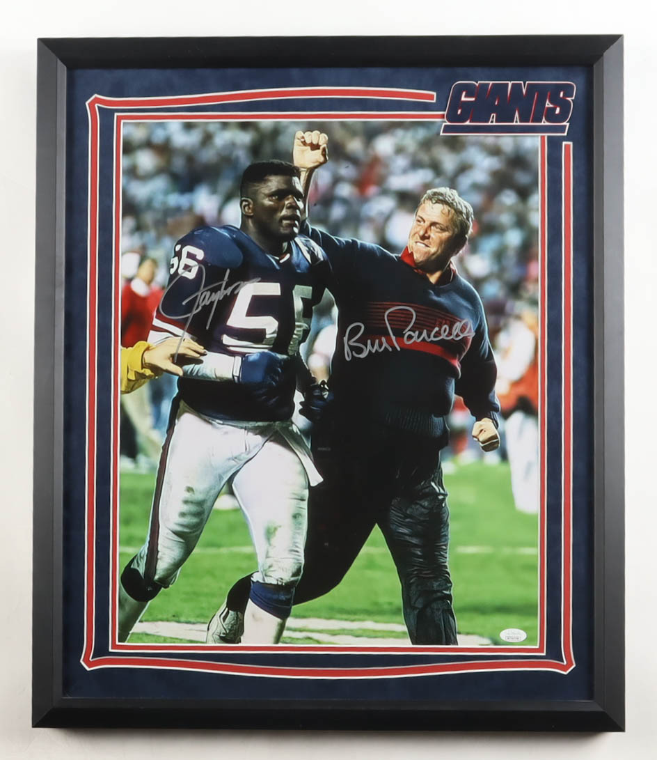 Custom frame measures 22" x 26" in size. Photograph is hand-signed by Bill Parcels and Lawrence Taylor.