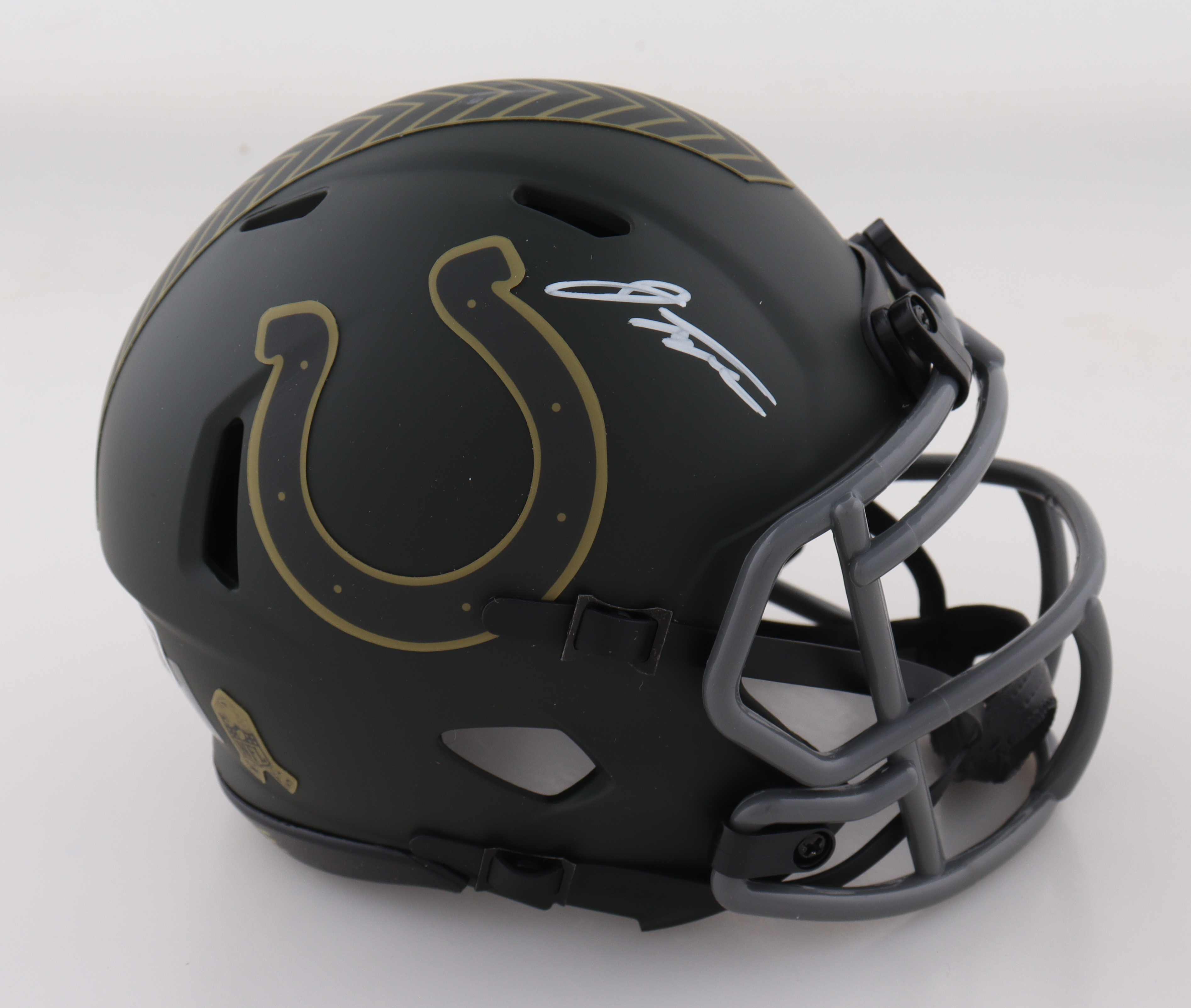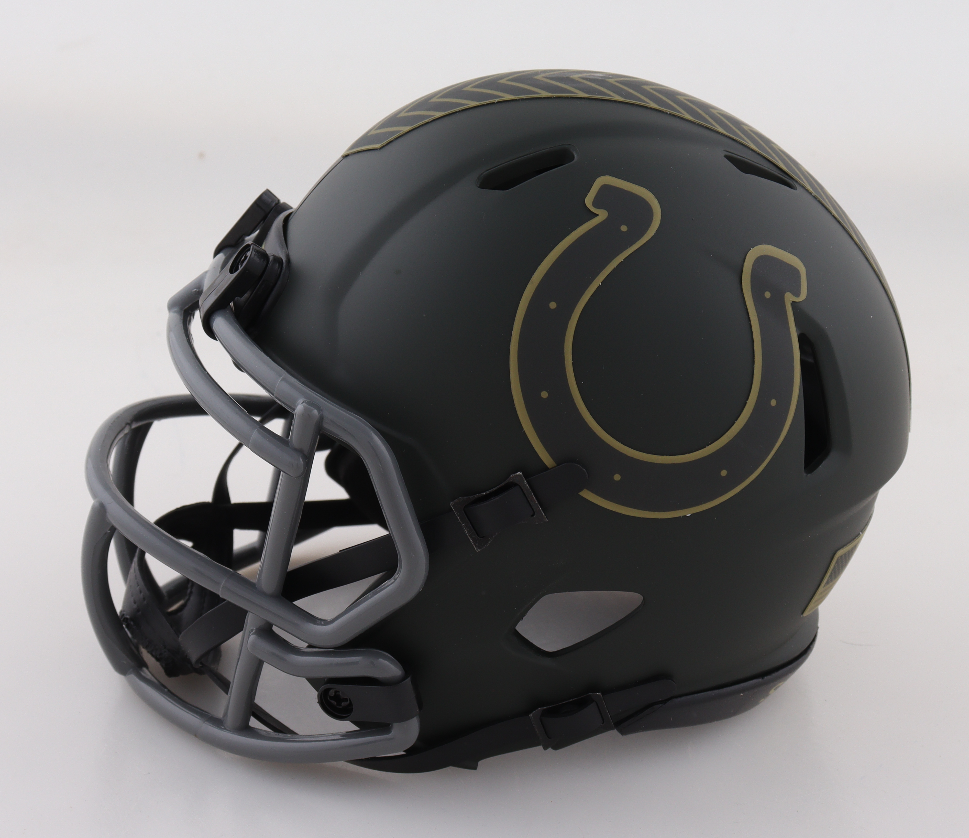 Riddell Indianapolis Colts Salute to Service Alternate Speed Mini Helmet. Hand-signed by Jonathan Taylor.